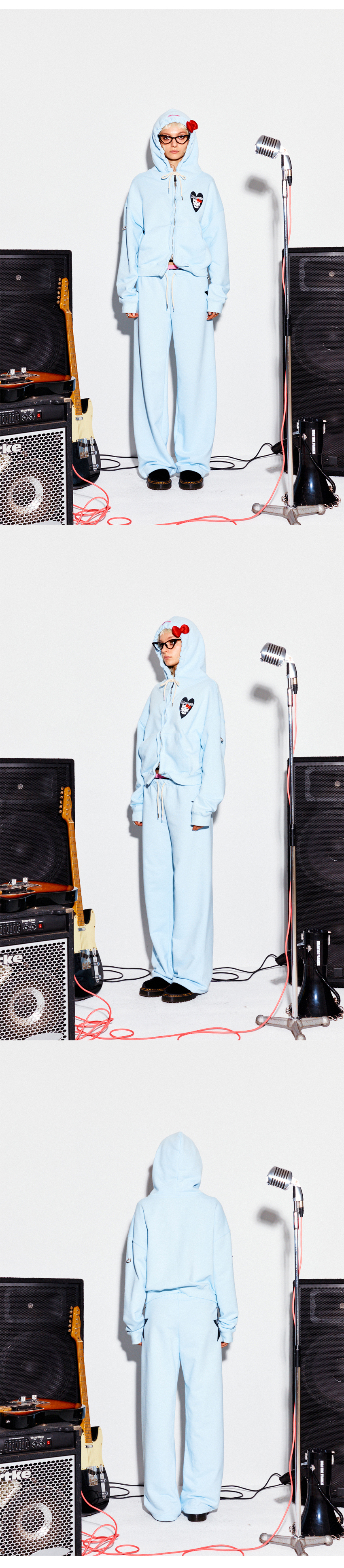 Model : Maria 171cm / 46kg 중앙 지퍼 양쪽에 와이어가 삽입된 크롭 기장의 후드 집업입니다 와이어를 활용해 후드 지퍼를 원하는 만큼 오픈하거나 잠근 뒤 다양한 형태로 연출할 수 있어 재미있는 스타일링이 가능합니다 소매 양쪽에는 아일렛 디테일이 적용되어 O링을 탈부착할 수 있으며 왼쪽 가슴에는 두 가지 캐릭터를 패러디한 프랭키의 그래픽 아트웍이 더해졌습니다 플라스틱 리본을 핸드메이드로 부착해 키치한 무드를 강조했습니다 후드 상단에는 프랭키 메인 라벨 포인트를 더했으며 2WAY 지퍼를 적용해 착용감과 활동성을 고려하여 설계되었습니다 -혼용률- 면 60% 폴리에스테르 40% -주의- 드라이클리닝 권장 단독 세탁 이염 주의 옷을 뒤집어 미지근한 물에 세탁 표백제 및 강력한 세제 사용 금지 건조기 사용 금지 프린트 부분 다림질 금지 ※ 세탁 시 반드시 O링을 제거한 후 진행해 주세요 위 주의사항 미준수로 인한 교환 및 환불은 불가합니다 Made in KOREA