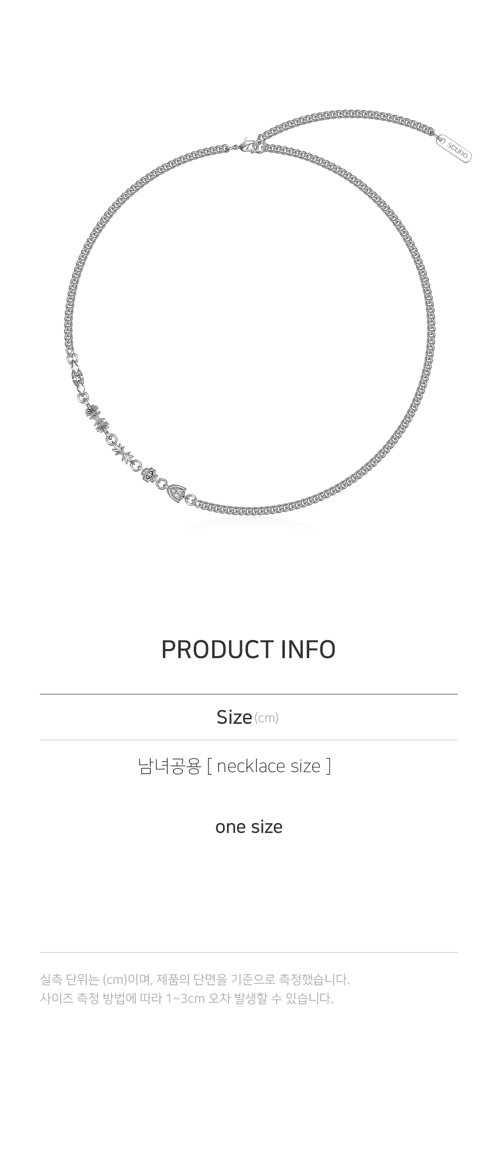 SCUDO S LINE Material High-quality metal base (Brass) Finish 6micron precious metal plating Size O/S 55cm (43cm 중간 0링) 중량 : 19g 스쿠도의 주얼리는 맞춤 handcraft 주얼리로, 7~10일 제작기간이 소요됩니다. (주말 / 공휴일 제외) 추가 제품 상담이 필요하시면, 문의 부탁드립니다.