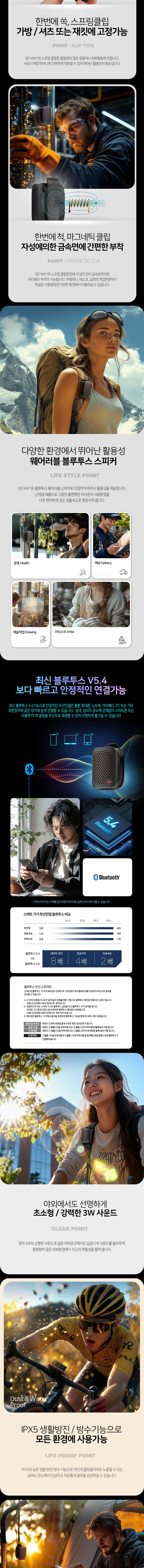 1. 84g의 압도적인 가벼움 (Feather-light Portability) ##달걀 한 알 정도의 무게(84g)로, 옷이나 가방에 착용해도 무게감이 거의 느껴지지 않습니다. 등산이나 러닝처럼 장시간 움직임이 많은 활동에서 피로감을 주지 않는 것이 가장 큰 강점입니다. 2. 3-Way 멀티 마운팅 시스템 (Versatile Mounting) 단순한 스피커가 아니라 '웨어러블 기기'로서의 활용도가 매우 높습니다. ##클립: 바지벨트, 가방 끈, 포켓에 단단히 고정. ##자석: 운동 기구, 차량 본체, 캠핑용 철제 테이블 등에 부착. ##스트랩: 손목에 걸거나 고리에 매달아 분실 방지. 3. 핸즈프리 통화 기능 (Hands-free Calling) ##고감도 마이크가 내장되어 있어 운동이나 작업 중에 스마트폰을 꺼낼 필요 없이 바로 통화가 가능합니다. 자전거 라이딩이나 등산 스틱을 사용하는 상황에서 안전과 편의성을 동시에 제공합니다. 4. 아웃도어 특화 설계 IPX5 방수