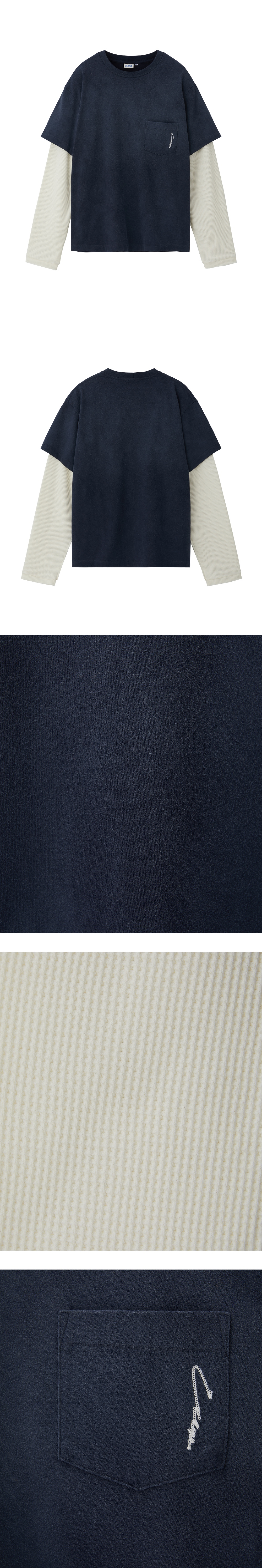 - 레귤러 핏의 레이어드 티셔츠 - 와플 조직으로 구성된 긴팔 소매 디자인 - 긴팔 소매 밑단의 데끼 마감과 오버로크 디테일로 포인트 - 좌측 포켓의 'LLEGE' 필기체 체인 자수 로고 디테일 - 노멀 워싱과 스노우 이펙트 가공 처리로 빈티지한 질감 표현