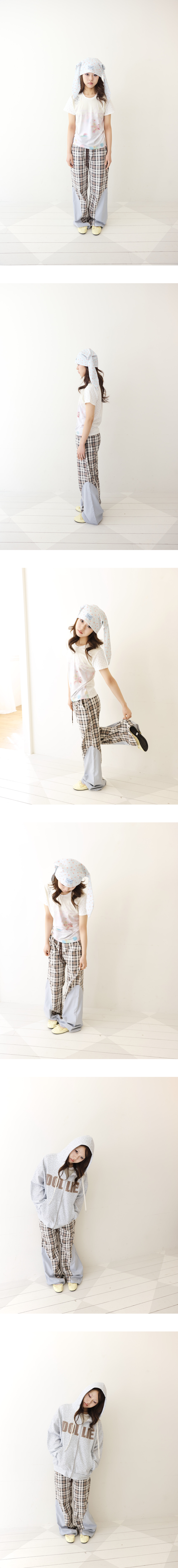 - 오버 부츠컷 실루엣 - 전면부 양측 내부 포켓, 허리 스트링 - 브라운 / 블루 체크 원단 배색