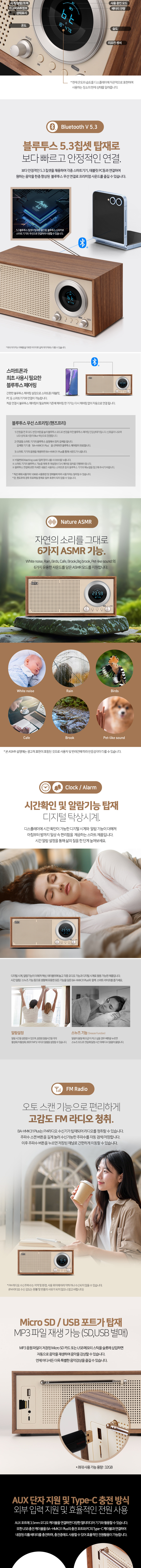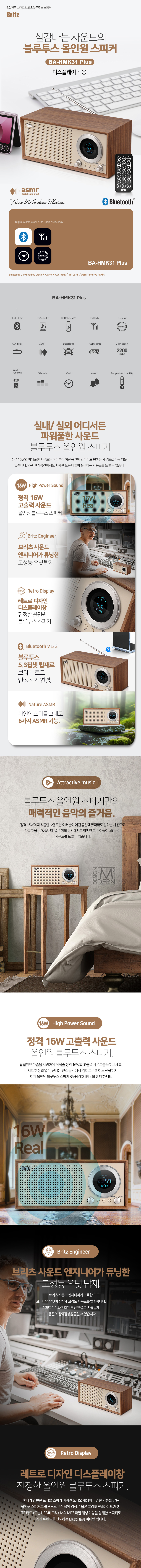 ## 1. 16W(8W x 2)의 강력한 스테레오 사운드 듀얼 풀레인지 유닛: 소형 스피커임에도 좌우 8W씩 총 16W의 고출력을 지원하여 거실이나 사무실 등 넓은 공간에서도 선명하고 풍부한 음량을 제공 Wooden Enclosure: 플라스틱 소재가 아닌 고밀도 목재 외관을 채택하여, 공진 현상을 최소화하고 더욱 따뜻하고 깊이 있는 저음을 구현 ## 2. 압도적인 편의성 다양한 재생 모드: 블루투스뿐만 아니라 FM 라디오, USB 메모리, TF(microSD) 카드, AUX 입력을 모두 지원하여 스마트폰 없이도 음악 감상이 가능 생활 밀착형 기능: 전면 디스플레이를 통해 시간, 실내 온도, 습도를 한눈에 확인할 수 있으며, 알람 기능과 ASMR 음원 내장으로 침실용 시계/스피커로 활용도가 매우 높음 ## 3. 뉴트로 인테리어 가치 감성적인 디자인: 클래식한 우드 텍스처와 현대적인 LED 디스플레이가 조화를 이루어 어떤 공간에 두어도 세련된 인테리어 소품 역할 무선 리모컨