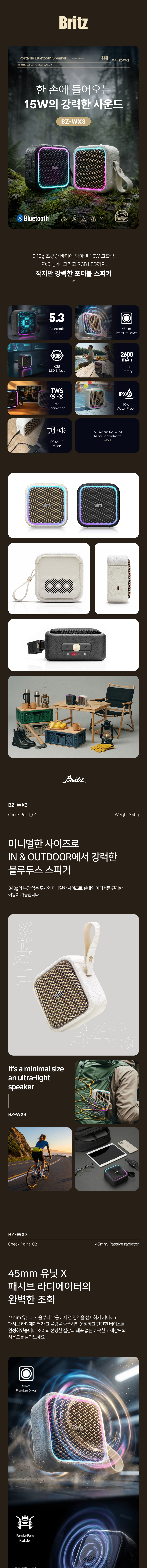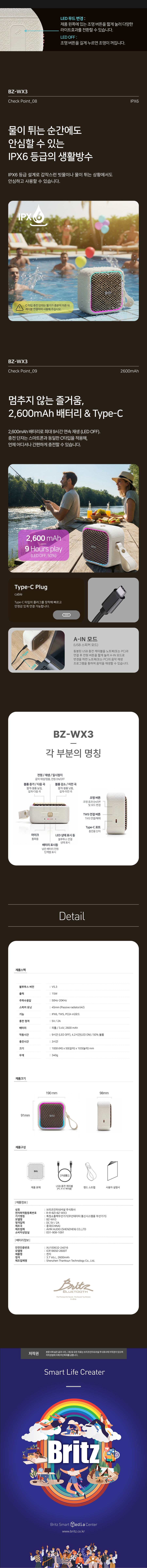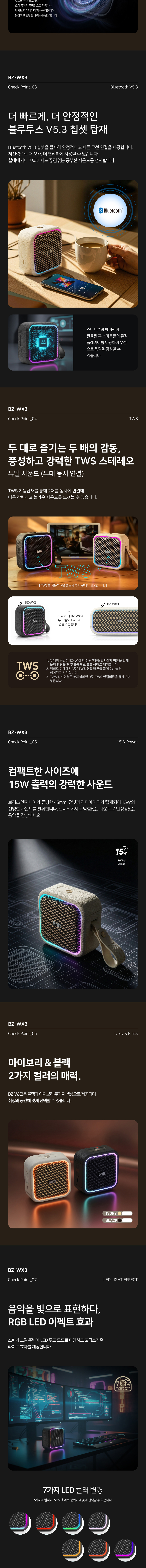 1. 체급을 뛰어넘는 15W 고출력 사운드 보통 이 정도 크기의 미니 스피커는 5W~10W 내외의 출력을 가집니다. BZ-WX3는 정격 15W의 강력한 출력을 갖춰, 야외 캠핑장이나 소음이 있는 공간에서도 소리가 묻히지 않고 선명하게 전달 2. IPX6 등급의 강력한 방수 성능 IPX6 등급을 인증받았습니다. 갑작스러운 우천 시나 수영장, 계곡 등 물가에서도 고장 걱정 없이 안심하고 사용할 수 있는 진정한 아웃도어 스피커 3. TWS(무선 스테레오) 확장성 동일 모델 2대를 무선으로 연결하면 좌우 채널이 분리된 리얼 스테레오 사운드를 즐길 수 있습니다. 1대일 때보다 훨씬 넓은 공간감을 제공하며, 총 30W의 출력을 낼 수 있어 파티나 영화 감상 시 유용 4. 감성적인 디자인과 라이팅 효과 '뉴트로' 감성을 자극하는 아이보리 컬러와 콤팩트한 외형은 인테리어 소품으로도 손색이 없습니다. 여기에 음악 비트에 맞춰 반응하는 RGB LED 이펙트가 더해져 캠핑이나 야간 사용 시 특별한 분위기를 연출
