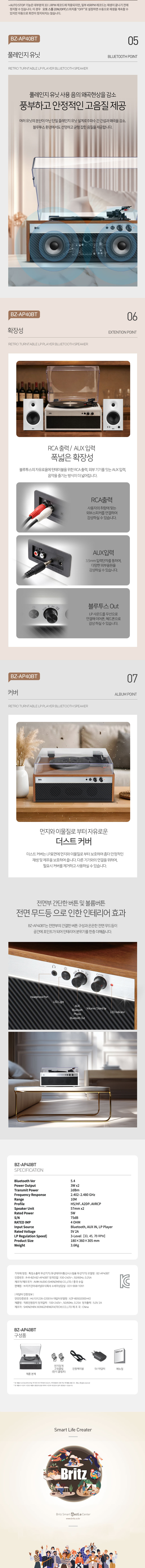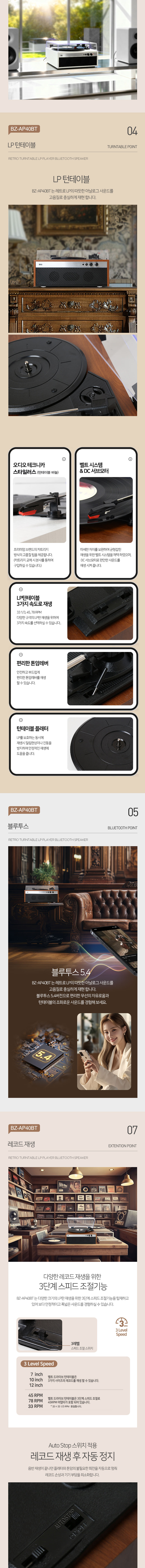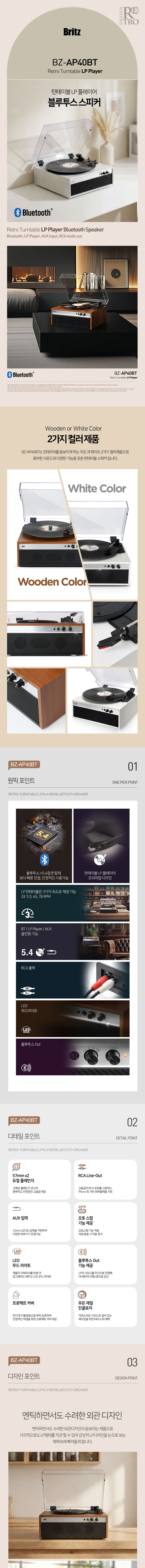 1. 주요 핵심 기능 (Feature) 양방향 블루투스 v5.4 지원: Bluetooth IN: 스마트폰과 연결하여 본체의 내장 스피커로 음악을 감상할 수 있습니다. Bluetooth OUT: LP 사운드를 외부 블루투스 스피커나 헤드폰으로 전송하여 무선으로 감상할 수 있습니다. 올인원 재생 시스템: 별도의 앰프나 스피커 연결 없이도 자체 6W(3W+3W) 풀레인지 유닛을 통해 바로 음악을 들을 수 있습니다. 3단계 속도 조절: 33 1/3, 45, 78 RPM을 모두 지원하여 모든 규격의 LP(LP, EP, SP) 재생이 가능합니다. 피치 조절(Pitch Control): 섬세한 속도 조절 노브가 있어 음악의 높낮이와 템포를 미세하게 튜닝할 수 있습니다. 2. 디자인 및 편의 사양 인테리어 오브제: 우든(Antique)과 화이트 두 가지 컬러로 출시되었으며, 전면의 화이트 LED 무드등이 시각적인 감성 더스트 커버: 투명 프로텍트 커버가 기본 장착되어 바늘(카트리지)과 LP를 먼지로부터 보호