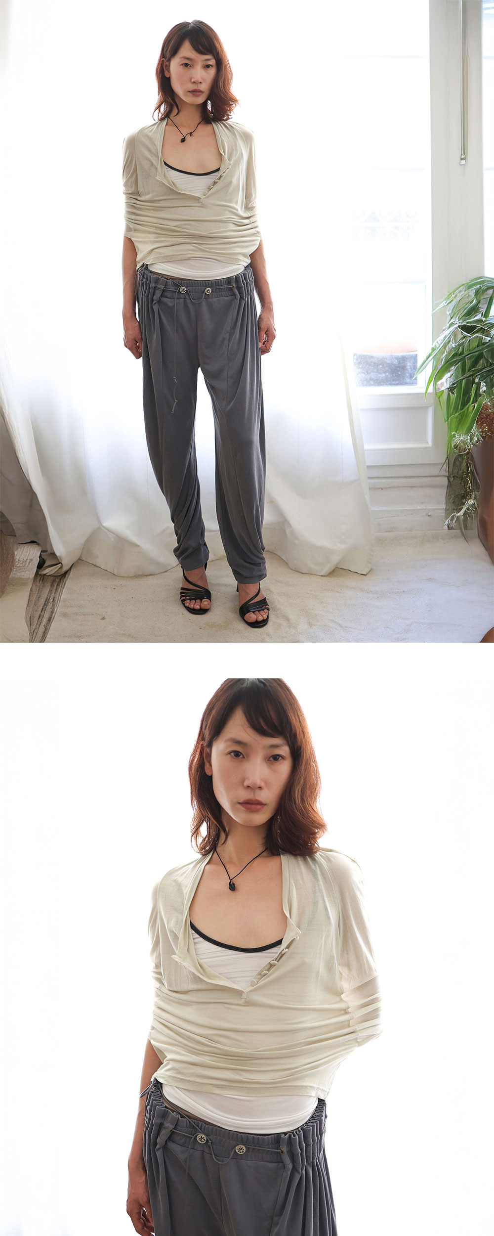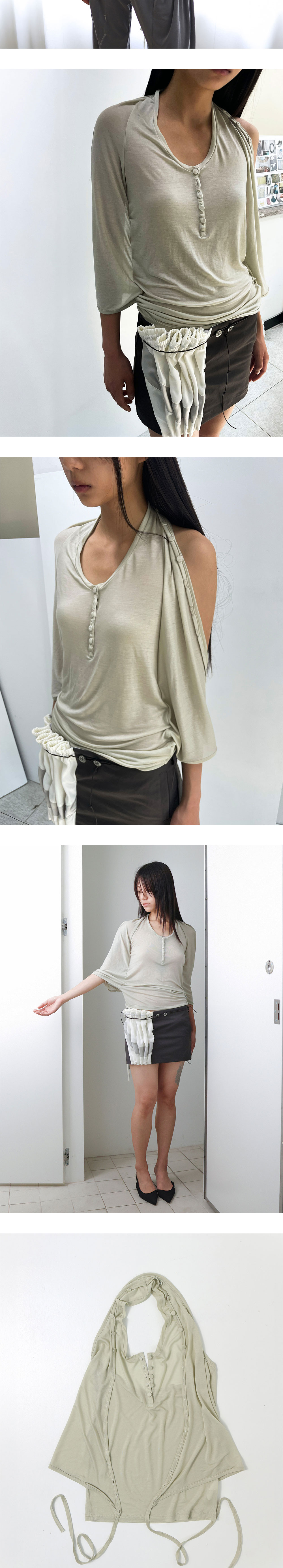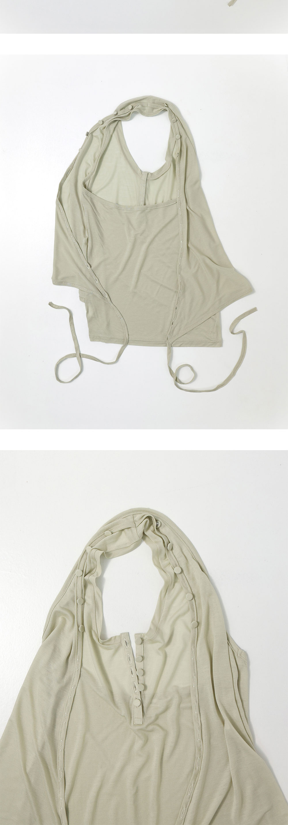 울리카 상투스 우먼 홀터 랩 슬리브리스 옐로우 베이지 입니다. - 깊은 U넥 디자인 - 전면 랩 형태 - 전면 오픈 가능한 단추 여밈 디테일 - 5개의 커버단추 디테일로 소매 변주 및 다양한 실루엣 연출 가능 - 얇고 부드러운 텍스쳐의 원단감