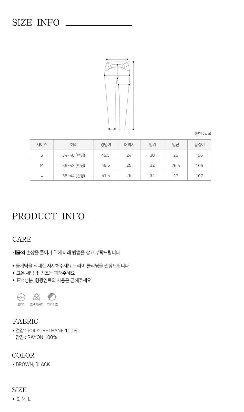 * 모델은 총장이 1CM 긴 107CM 촬영용 샘플을 착용했습니다 * 매끈한 터치감 * 부드런 안감 처리 * 허리 밴딩 * 부츠컷 핏