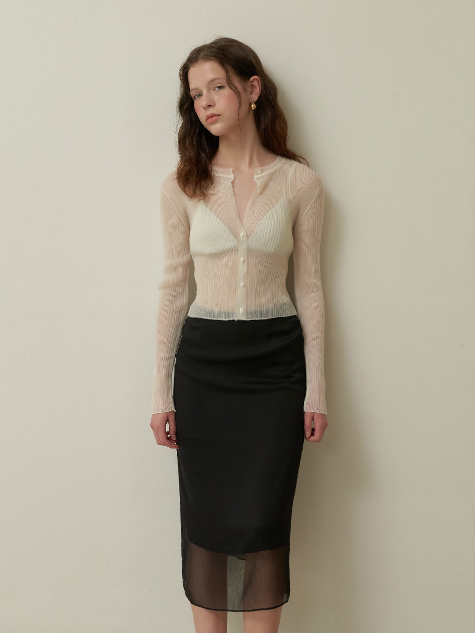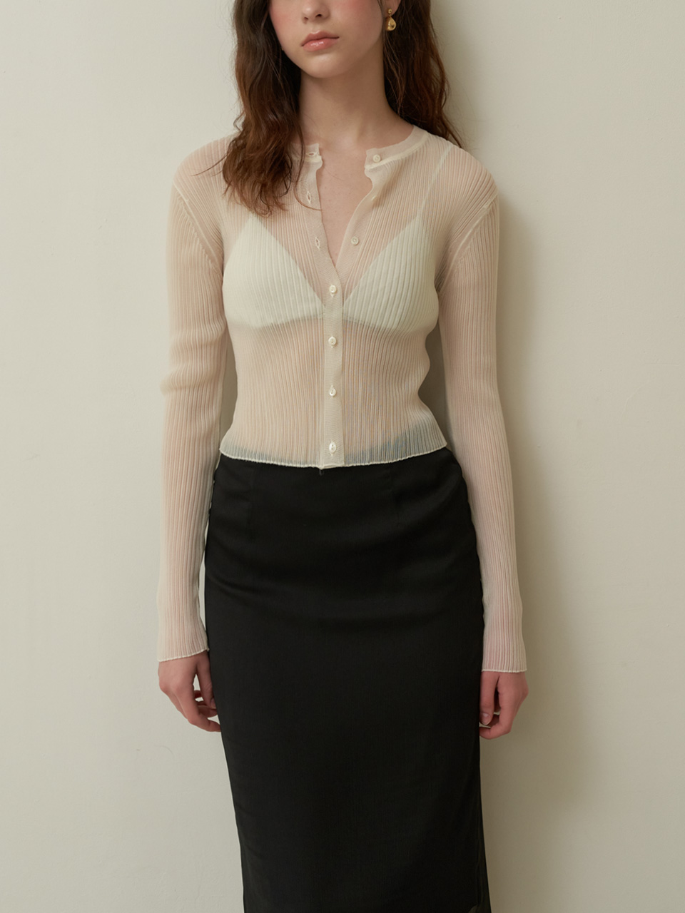 은은하게 비치는 시어한 글로시감이 특징인 니트 소재로 제작된 가디건입니다.