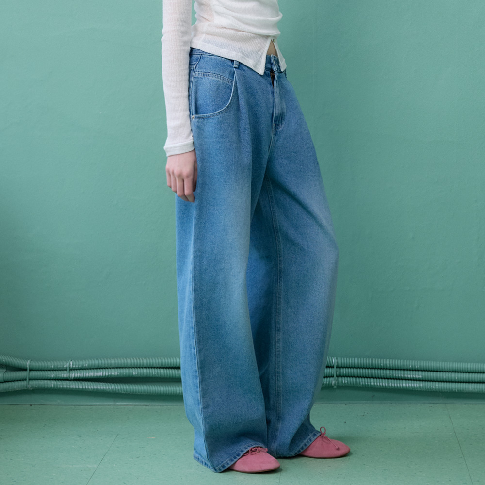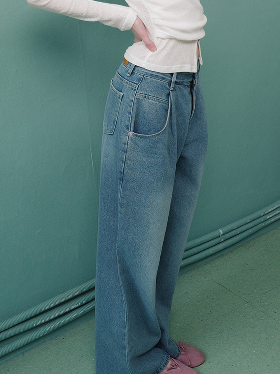 핀턱 디테일이 더해져 입체적인 실루엣이 돋보이는 와이드 데님 팬츠입니다.