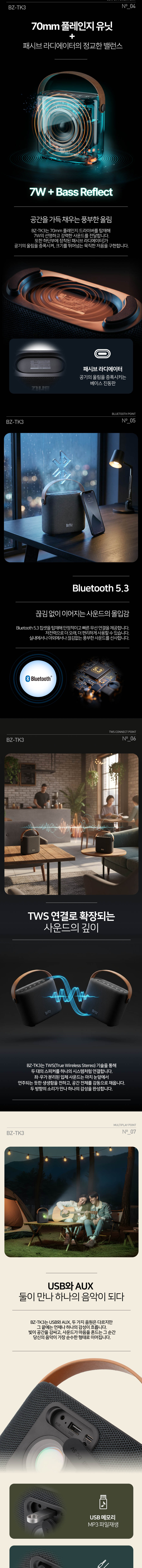 1. 강력한 저음 구현 (우퍼 시스템) 70mm 대구경 유닛: 일반적인 소형 블루투스 스피커보다 큰 드라이버를 탑재하여 소리가 시원시원하고 명확합니다. 패시브 라디에이터: 스피커 하단에 배치된 진동판이 저음역대를 증폭시켜, 크기 대비 묵직하고 타격감 있는 '우퍼 사운드'를 선사합니다. 2. 공간을 채우는 스테레오 확장 (TWS 모드) 무선 1+1 연결: 동일 모델 2대를 무선으로 연결하면 좌우 채널이 분리된 리얼 스테레오 사운드를 즐길 수 있습니다. 출력 강화: 한 대(7W)일 때보다 두 배(14W)의 출력을 확보할 수 있어, 넓은 거실이나 야외 캠핑장에서도 충분한 공간감을 제공합니다. 가죽 핸들 스트랩: 견고한 가죽 소재의 스트랩이 일체형으로 부착되어 있어, 손으로 들거나 텐트 고리 등에 걸어두기 매우 편리합니다. 다양한 소스 지원: 블루투스 외에도 USB 메모리(MP3) 직접 재생과 AUX 유선 연결이 가능해 PC 스피커나 빔프로젝터용 스피커로도 활용도가 높습니다.