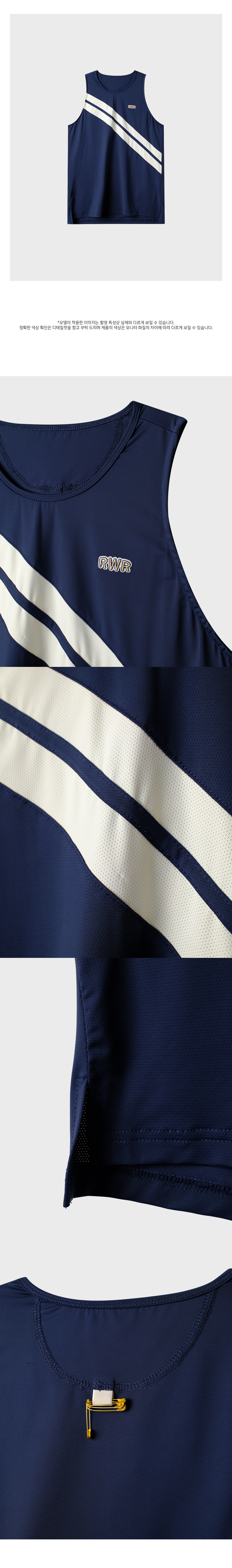 “Where Performance Meets Style.” - 클래식한 무드의 전면 사선 라인과 RWR 패치 로고 포인트 - Nylon 89%, Spandex 11%의 혼용으로 제작되어, 뛰어난 신축성과 부드럽게 몸에 감기는 가볍고 유연한 착용감 - 미세한 에어홀 구조로 뛰어난 통기성으로 쾌적한 착용감 유지 - 최적의 암홀 라인으로 자유롭고 편안한 활동성 - 뒷면에는 클래식한 느낌의 라벨과 마라톤 배번 옷핀 포인트 - Classic Line 3inch Shorts와 셋업 착용 Model - 178cm / 65kg 1 Size 착용
