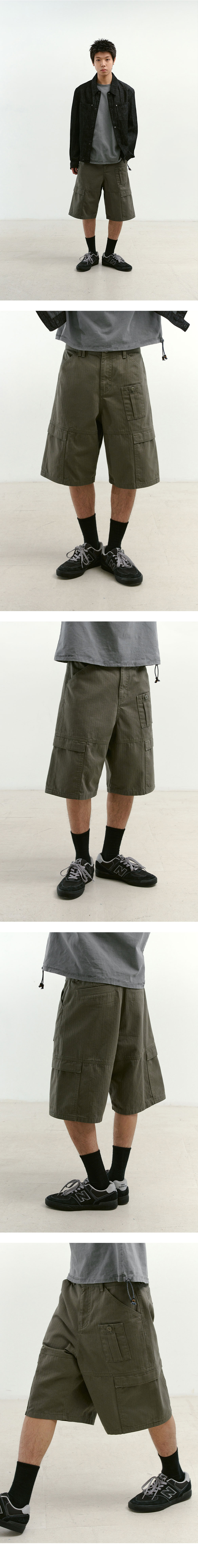 Paneled Cargo Pockets Herringbone Twill Shorts (Washed Khaki) 빈티지한 무드가 돋보이는 하프 팬츠입니다. 전면 시가 포켓과 카고 포켓 포인트로 밀리터리한 무드를 연출할 수 있습니다. 헤링본 원단으로 표면에 자연스러운 결이 드러나, 룩에 포인트를 더해 줍니다. SPECIFICATION - Cotton 100% -10oz 헤링본 원단 - 원 워시 가공 - 빈티지 무드의 흔들이 캔톤 - 전면 시가 포켓·절개 카고 포켓 - 밀리터리 무드