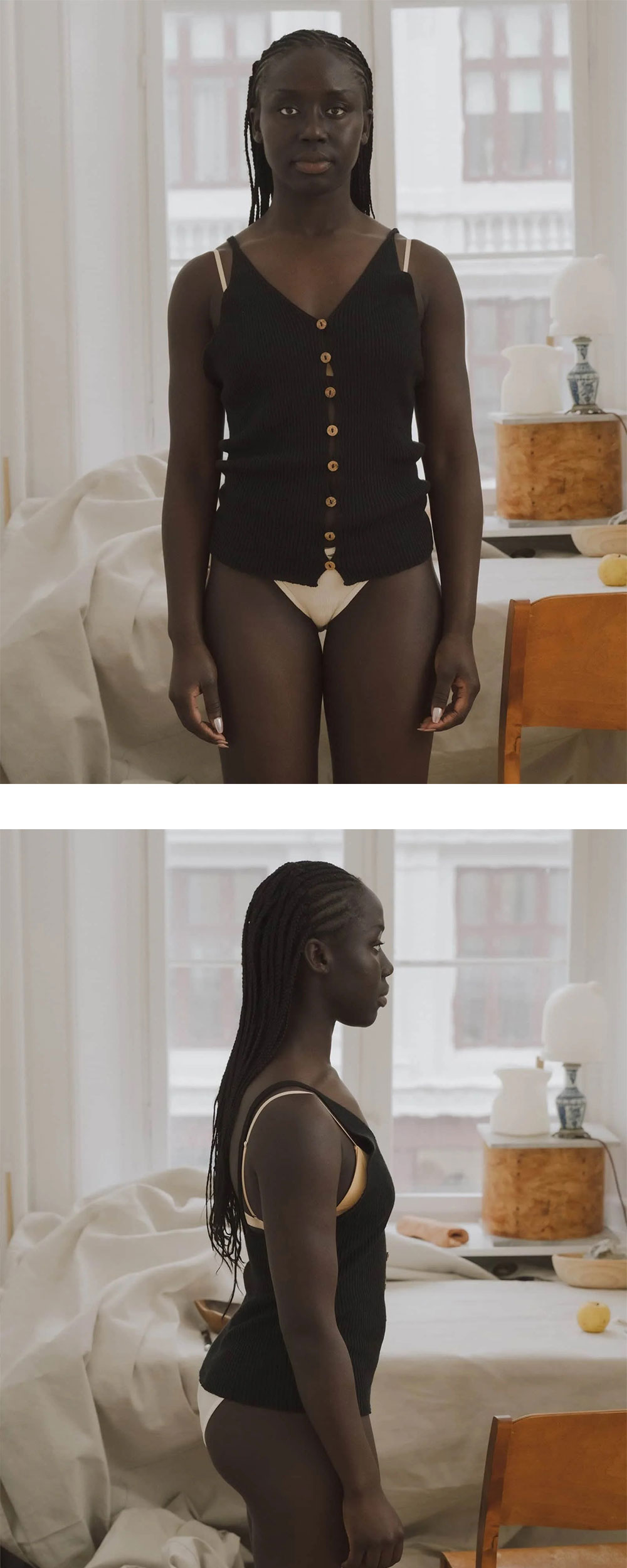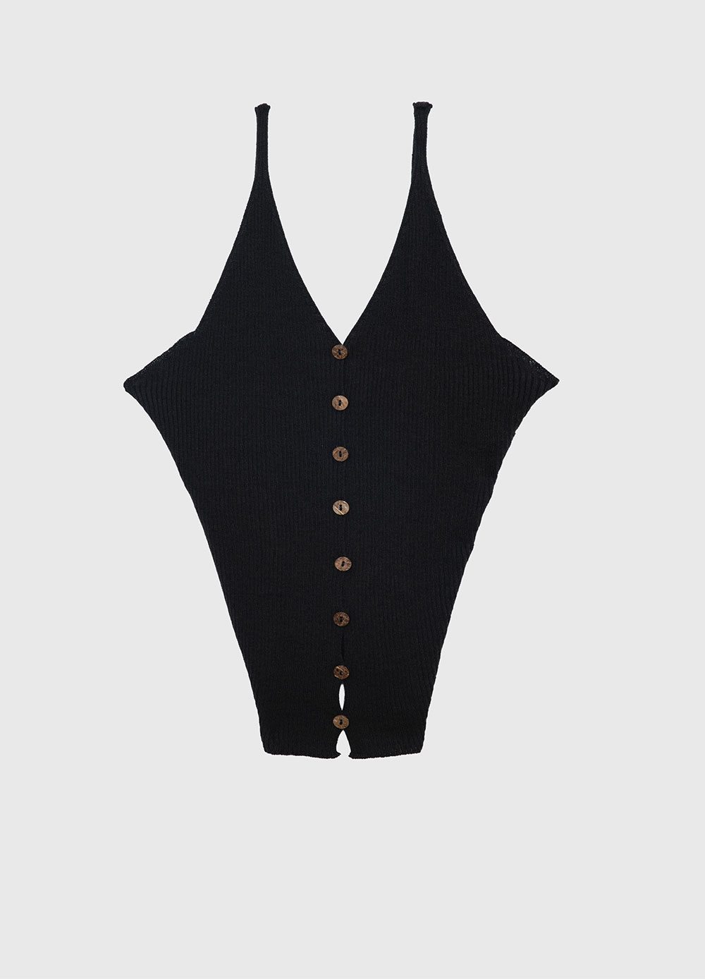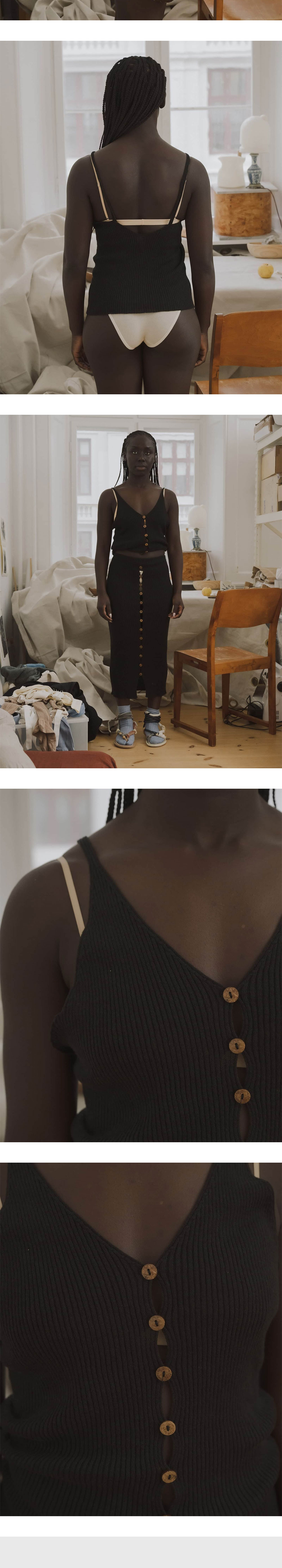 베이스레인지 우먼 오더 탑 블랙 입니다. - 전면 중앙의 여러 개 단추로 구성된 버튼다운 디테일 - 시원하게 파인 로우 V넥 라인 - 전체적으로 입체감이 느껴지는 세로 골지(리브) 텍스처