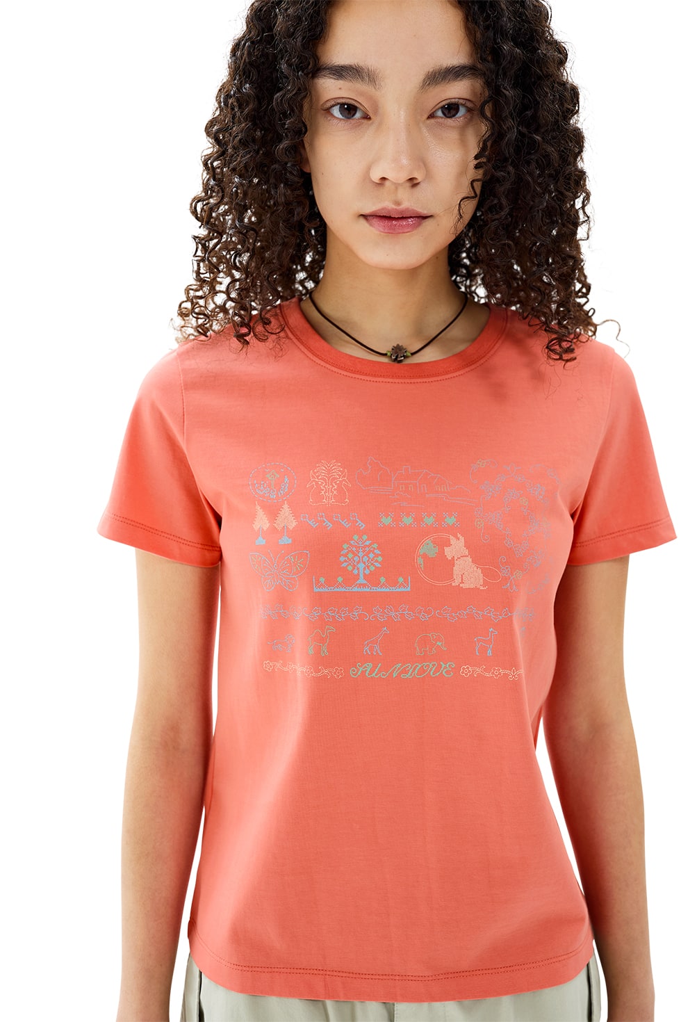 · 여성용 그래픽 반팔 티셔츠 · 면, 폴리에스터 혼방 원단 사용 · 경량성, 냉감, 통기성, 흡한속건 우수 · 원단의 겉면은 30수 면 원사로 방직해 고급스러운 질감 제공 · 원단의 속면은 폴리에스터 원사로 방직해 통기성, 냉감 강화 · 유연하고 소프트한 터치감 · 시즌 그래픽 프린트 Cotton 70% Polyester 30% Made in China Female - Small/169.5cm