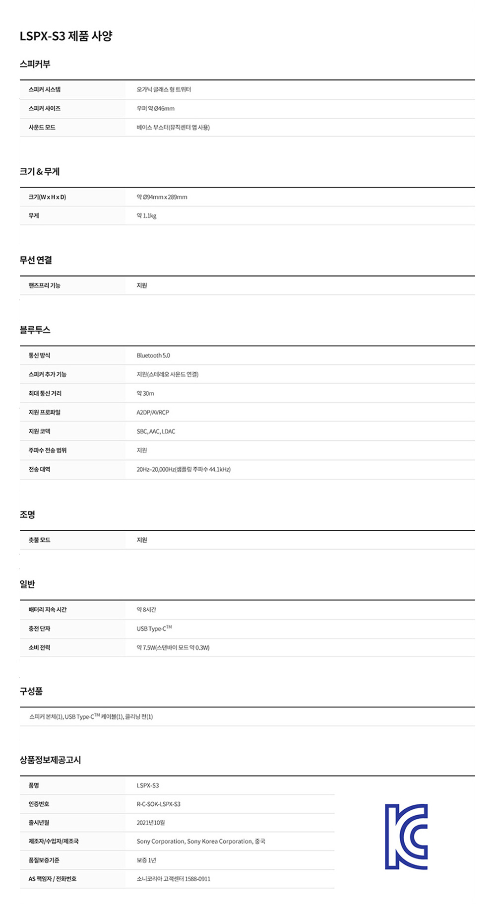 소니 LSPX-S3 실버 (소니코리아 정식 발매 제품)