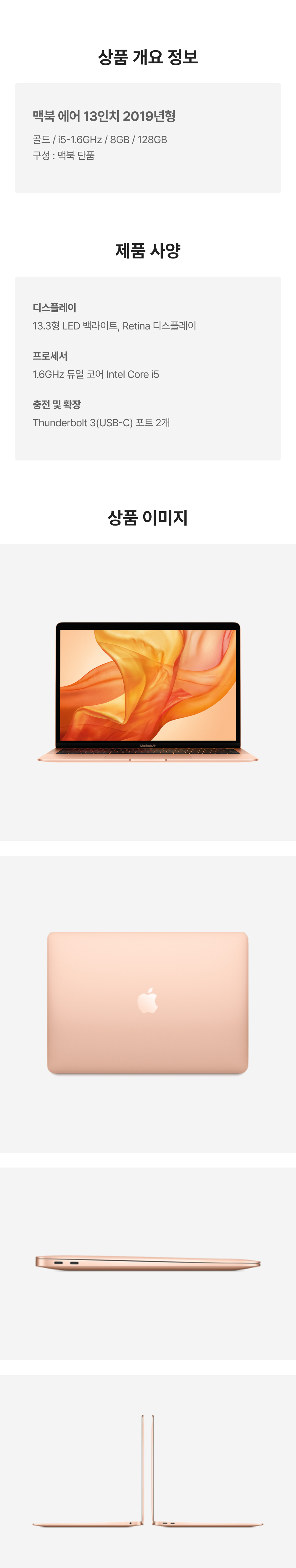 [B등급] 리퍼비시 2019 맥북 에어 13 i5-1.6GHz 128기가 SSD 8기가 램 골드