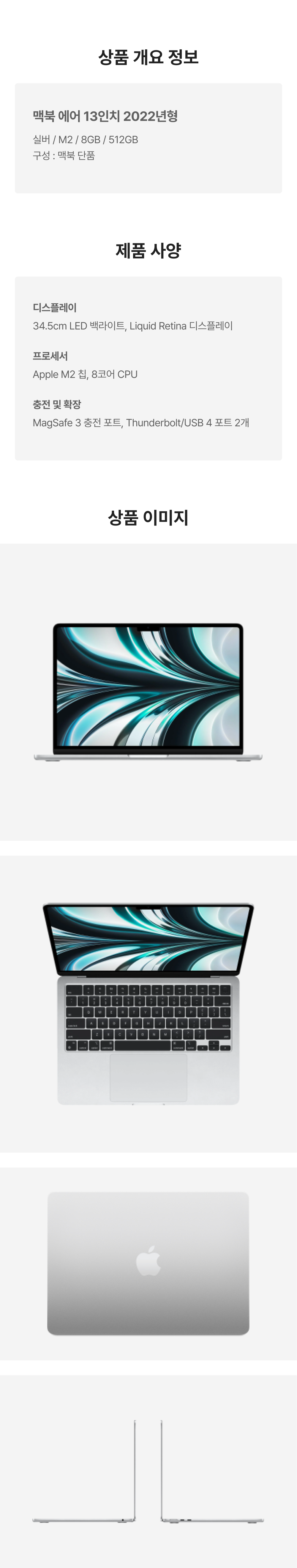 [B등급] 리퍼비시 2022 맥북 에어 13 M2 512기가 SSD 8기가 램 실버