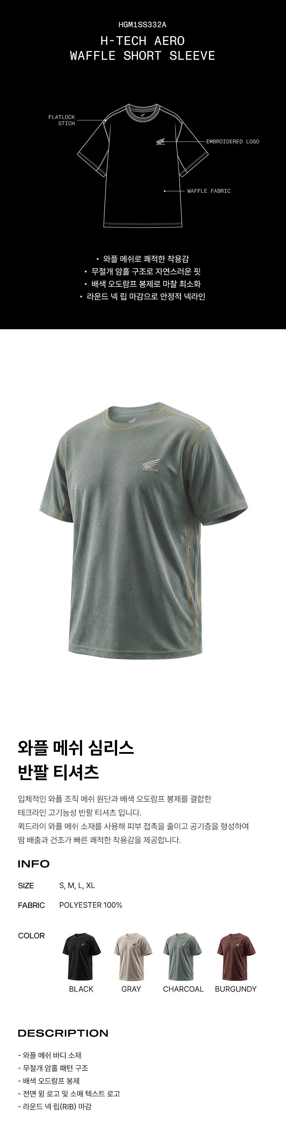 혼다 H-Tech 에어 레이어 시스템 와플 반팔 티셔츠 차콜