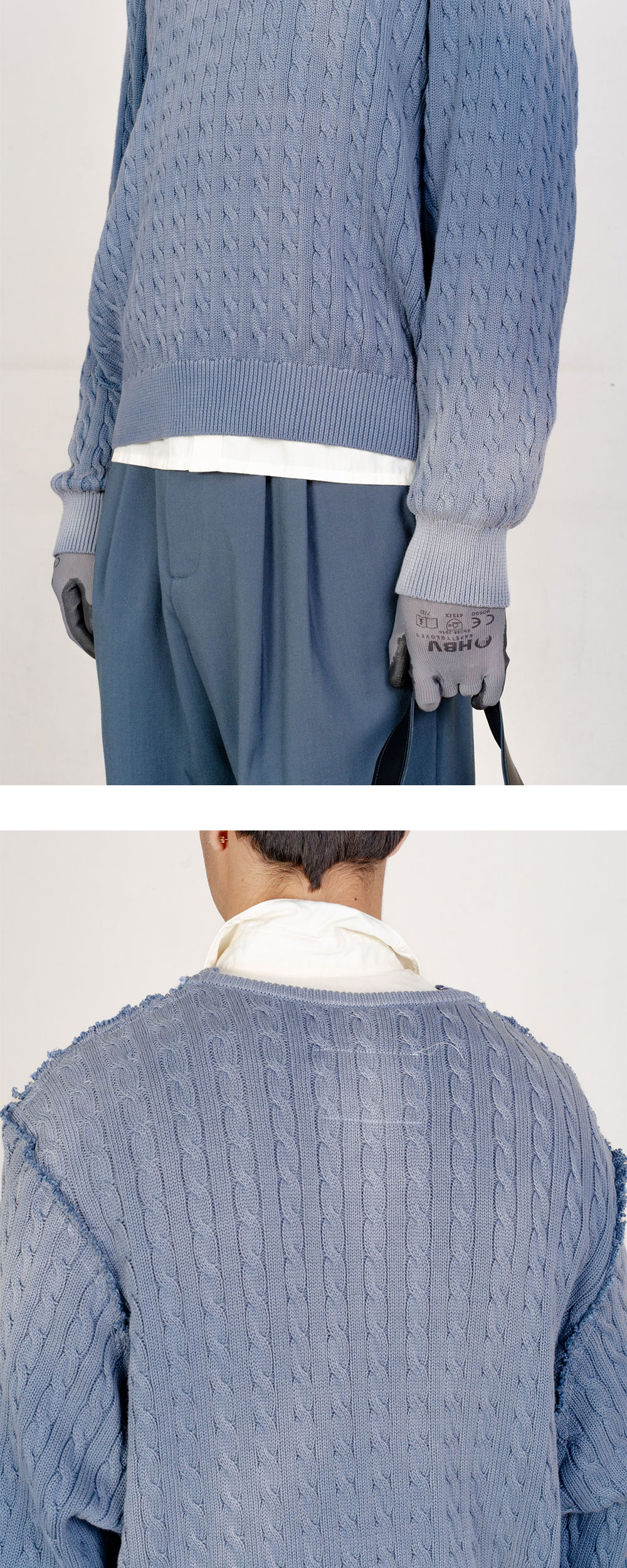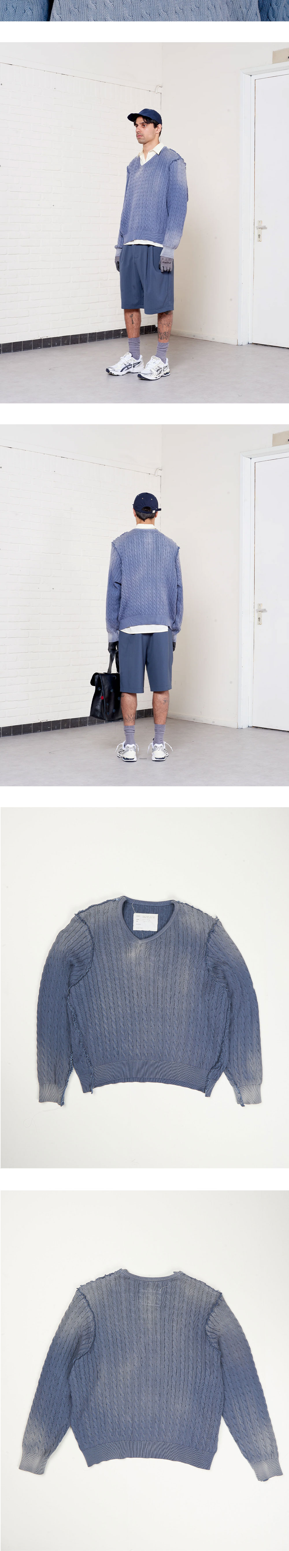 카미엘 포트젠스 프랑켄슈타인 케이블 브이넥 페트롤 입니다. - 전면의 입체적인 절개 라인 - 전체적으로 적용된 클래식한 케이블 꽈배기 니트 패턴 - 목 라인을 따라 자연스럽게 파인 브이넥 디자인 - 소매와 밑단, 절개 부위에 더해진 빈티지한 컷오프 및 올 풀림 디테일 - 불규칙한 워싱감이 느껴지는 오묘한 페트롤 블루 컬러