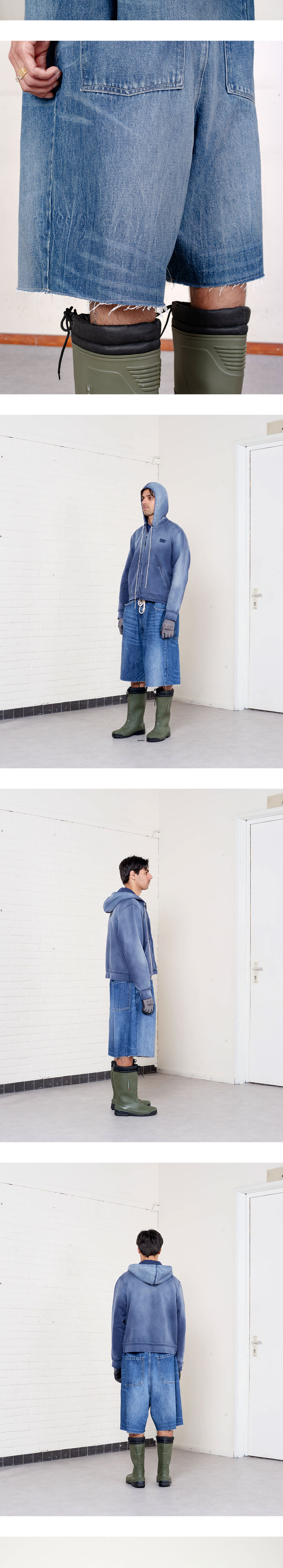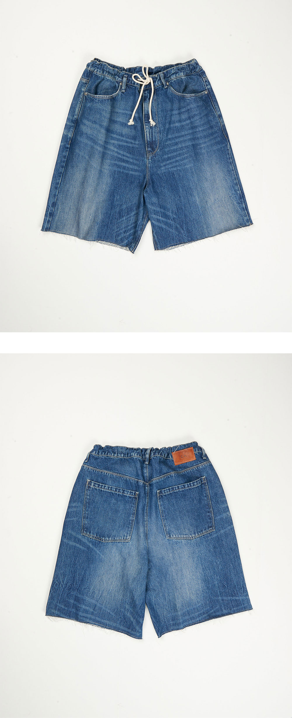 카미엘 포트젠스 빅 쇼츠 빈티지 워시 입니다. - 허리 라인의 밴딩 처리와 조절 가능한 화이트 로프 드로우스트링 - 허벅지부터 밑단까지 넓게 퍼지는 여유로운 오버사이즈 실루엣 - 자연스러운 수염 워싱이 가미된 빈티지한 블루 컬러감 - 거칠게 커팅된 듯한 느낌의 밑단 러프 마감 처리