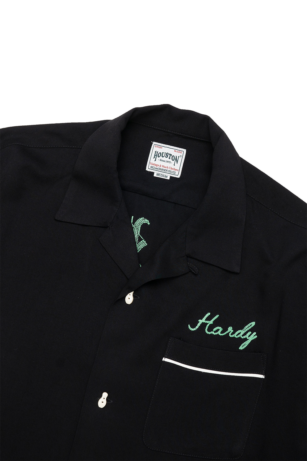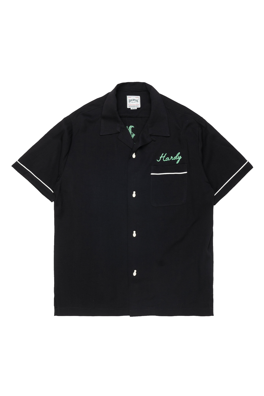 Houston Japan 41304 Bowling Shirt (Car) - Black HOUSTON의 SS 시즌 스테디 상품 볼링셔츠입니다. 적당한 두께의 레이온 100%을 사용하고, 시즌에 맞는 산뜻한 착용감이 특징입니다. 제품의 포인트인 볼링 핀 버튼도 오리지널로 제작했으며, 자수에는 블랙레터 스타일의 폰트가 빈티지함을 풍기는 제품입니다. * Rayon 100% * 빛에 의한 제품의 색감 차이가 존재 할 수 있습니다. * Made in China