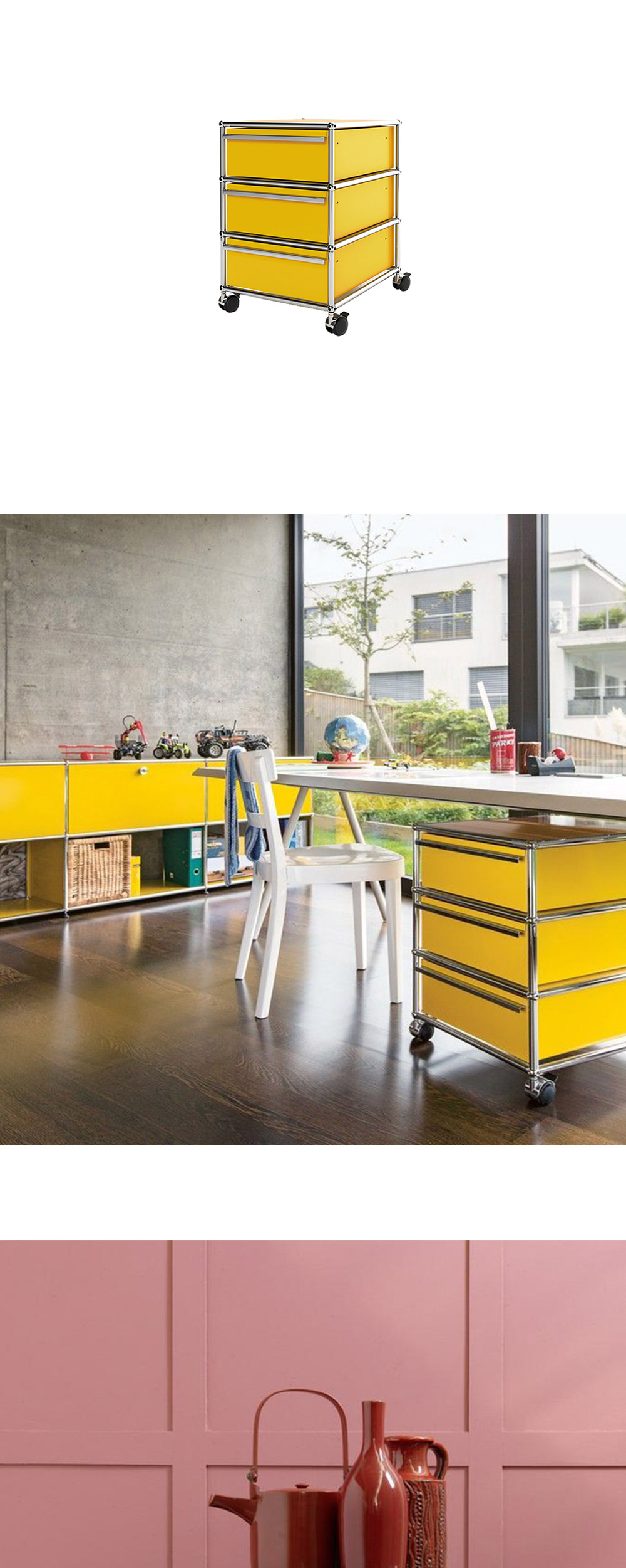 모두 서랍 형태로 된 이동형 수납장입니다. 오피스 공간에서 개인 수납장으로 사용하거나 공용으로 사용하는 비품을 담아두고 이동해가며 사용하기 좋습니다. 바퀴는 라킹 기능이 있어 이동하지 않을 때에는 움직이지 않도록 고정해 안정적으로 사용할 수 있습니다.