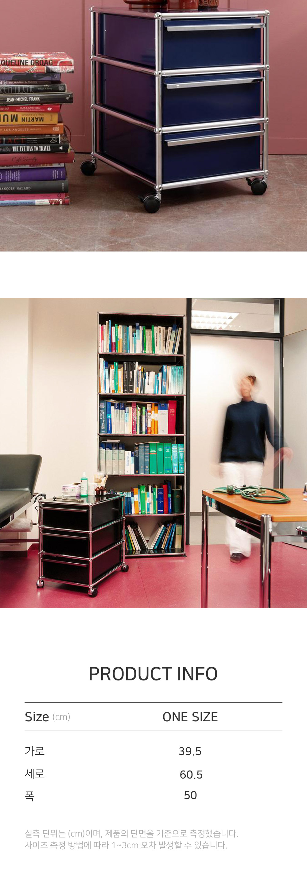 모두 서랍 형태로 된 이동형 수납장입니다. 오피스 공간에서 개인 수납장으로 사용하거나 공용으로 사용하는 비품을 담아두고 이동해가며 사용하기 좋습니다. 바퀴는 라킹 기능이 있어 이동하지 않을 때에는 움직이지 않도록 고정해 안정적으로 사용할 수 있습니다.