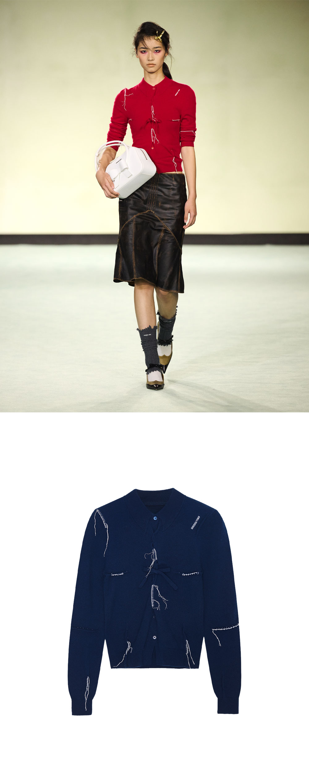 슈슈통 우먼 핀턱 앤드 스레드워크 니트 탑 네이비 블루입니다. - 다크 네이비 컬러에 화이트 자수 디테일의 가디건 - 불규칙하게 배치된 라인 자수 포인트 - 슬림한 핏과 탄탄한 시보리 마감 - 미니멀한 버튼 클로저 * 모델컷은 참고를 위한 이미지이며 같은 제품의 다른 컬러 제품입니다.