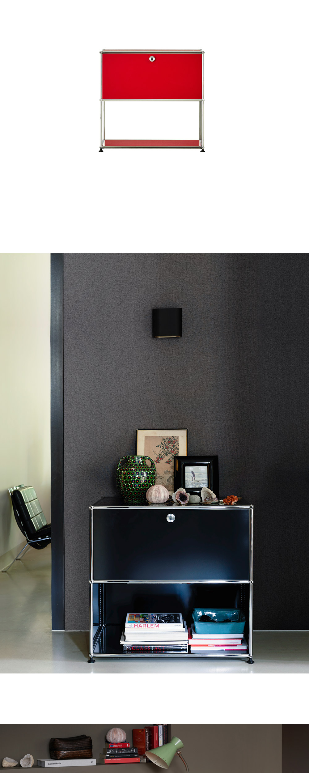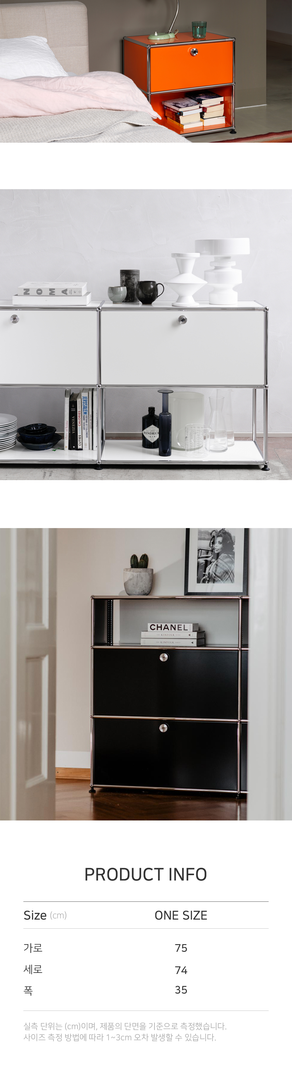 거실 한쪽에 스탠드 조명을 놓거나 오브제를 올려놓는 등 장식과 수납을 겸할 수 있는 콘솔형 모듈입니다. 하단은 오픈형 수납장으로 되어있으며, 상단은 드롭다운 도어로 되어있습니다.