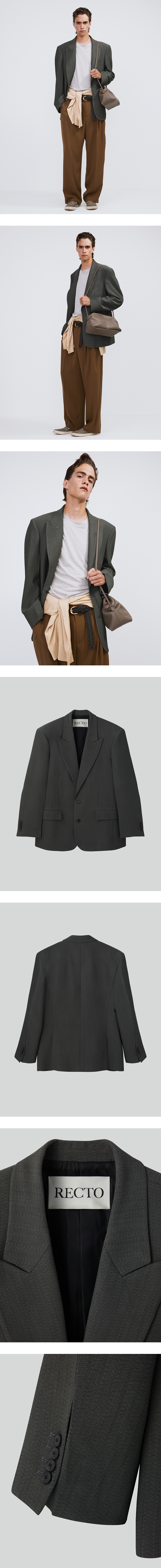 - 피크드 칼라 디테일의 대디 핏 재킷 - 빈티지 무드의 테일러드 디자인 - 싱글 브레스트, 절제된 디테일 구성 - 뒷면 밑단 트임, 내부 안감 처리 - 크레이프 조직의 울·비스코스 혼방 선염 소재 - MADE IN KOREA 착용사이즈 M HEIGHT 189CM/ BUST 32"/ WAIST 29"/ HIPS 34"/ SHOES 285MM