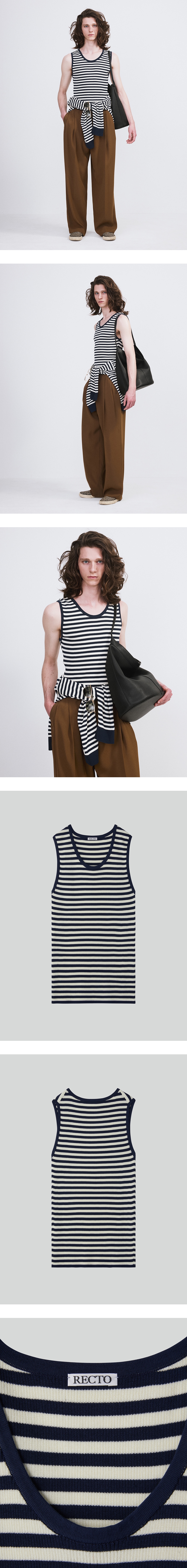 - 스트라이프 패턴의 골지 슬리브리스 니트 - 가볍고 통기성 좋은 여름용 니트웨어 - 신축성 있는 골지 조직으로 바디에 밀착되는 실루엣 - 레이어드 스타일링에도 활용도 높은 아이템 - MADE IN KOREA 착용사이즈 M HEIGHT 184CM/ BUST 33"/ WAIST 27"/ HIPS 34"/ SHOES 285MM