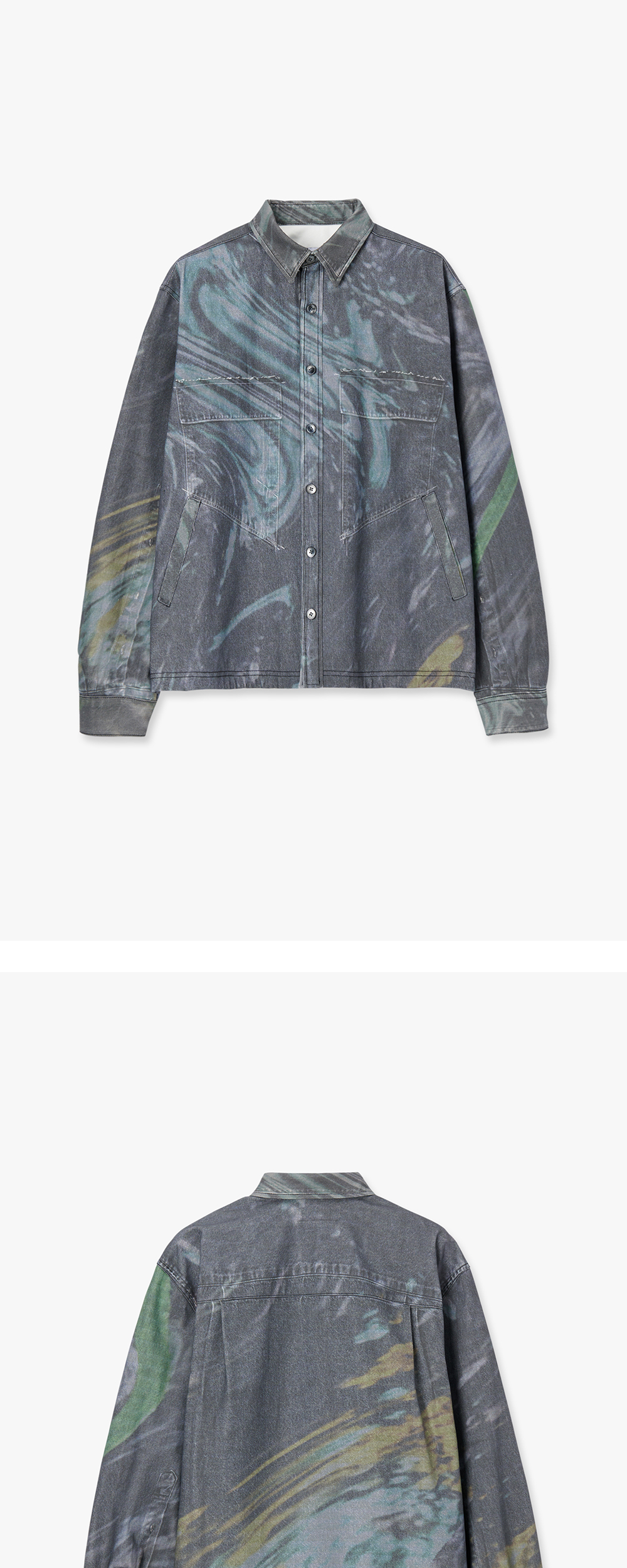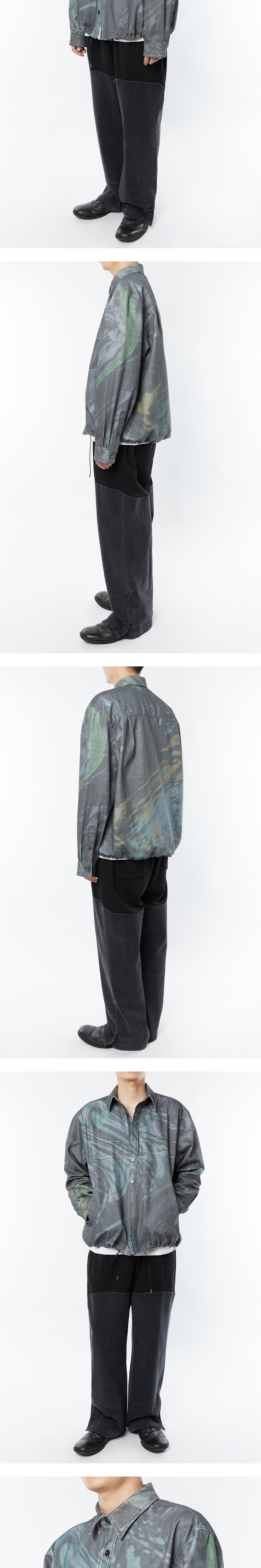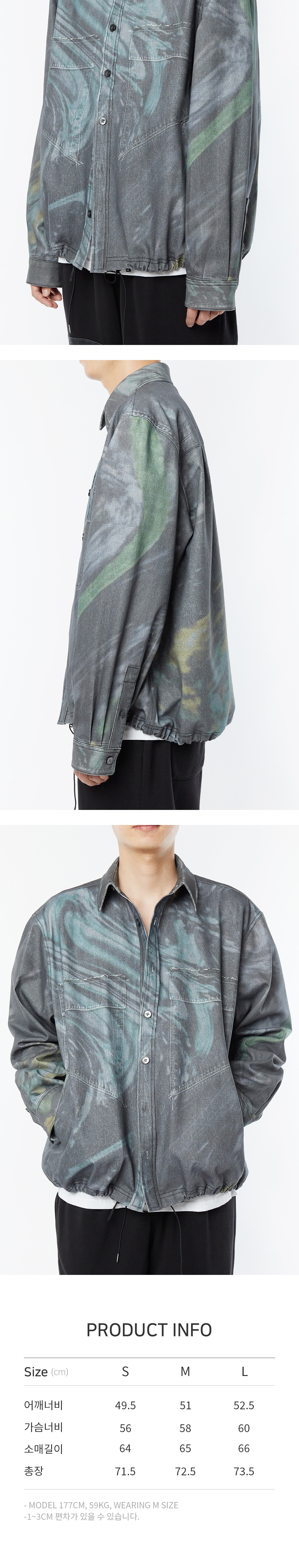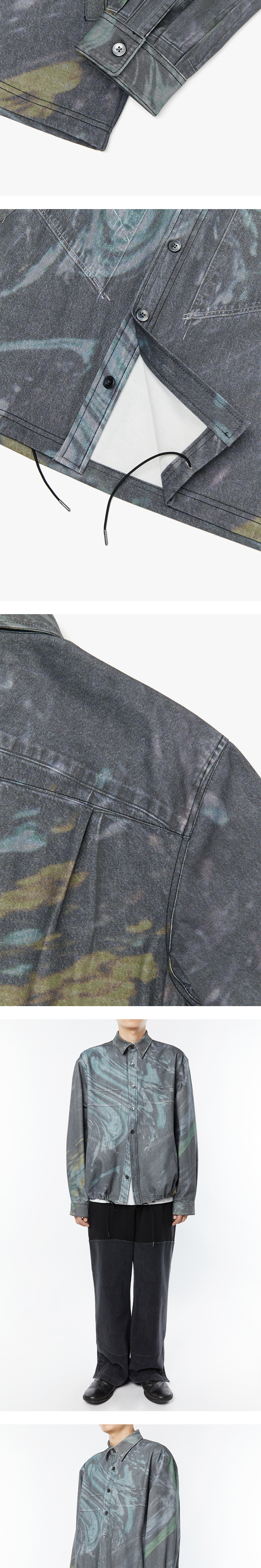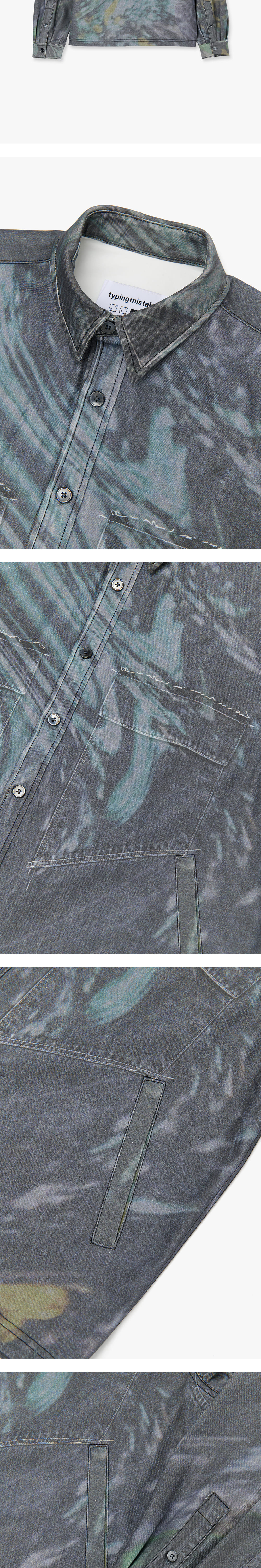 타이핑 미스테이크의 디자인 디렉터가 ‘DISTORT FOREST’라는 키워드를 가지고 실제 촬영한 숲을 디자인 프로그램으로 여러 차례 왜곡시키는 작업을 통해 탄생한 아트워크를 담은 디지털 워시드 데님 셔츠 자켓입니다. 직접 촬영한 이미지와 아트워크를 결합하여 타이핑 미스테이크만의 위트를 표현한 디지털 프린트 데님은 데님 소재 위에 데님 소재를 인쇄한 방식으로 각 파츠 별로 가장 완벽한 디지털 프린트를 적용하기 위해 그에 맞는 별도의 사진을 세심히 촬영하여 작업하였습니다. 여유 있는 소매통과 낙낙한 기장의 핏 볼륨감과 밑단 스트링으로 다양한 실루엣 연출이 가능합니다. “DIGITAL WASHED DENIM PANTS”와 세트업으로 활용 가능합니다. 해상도에 따라서 색상 차이가 있을 수 있습니다.