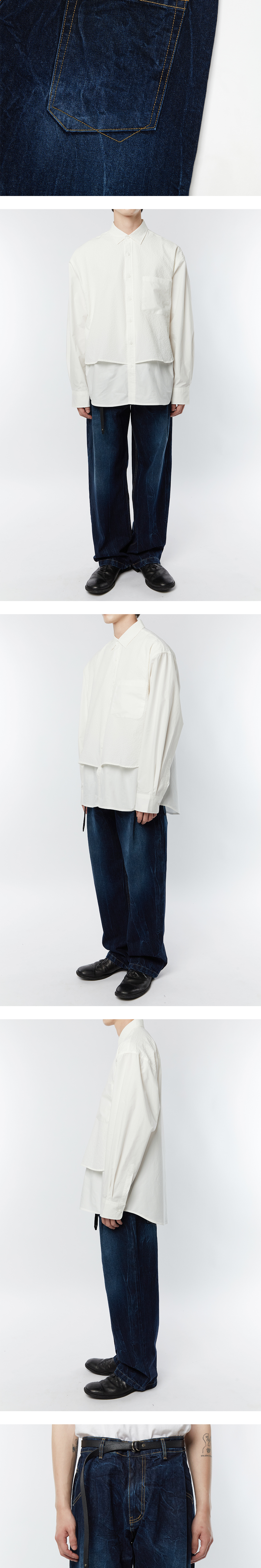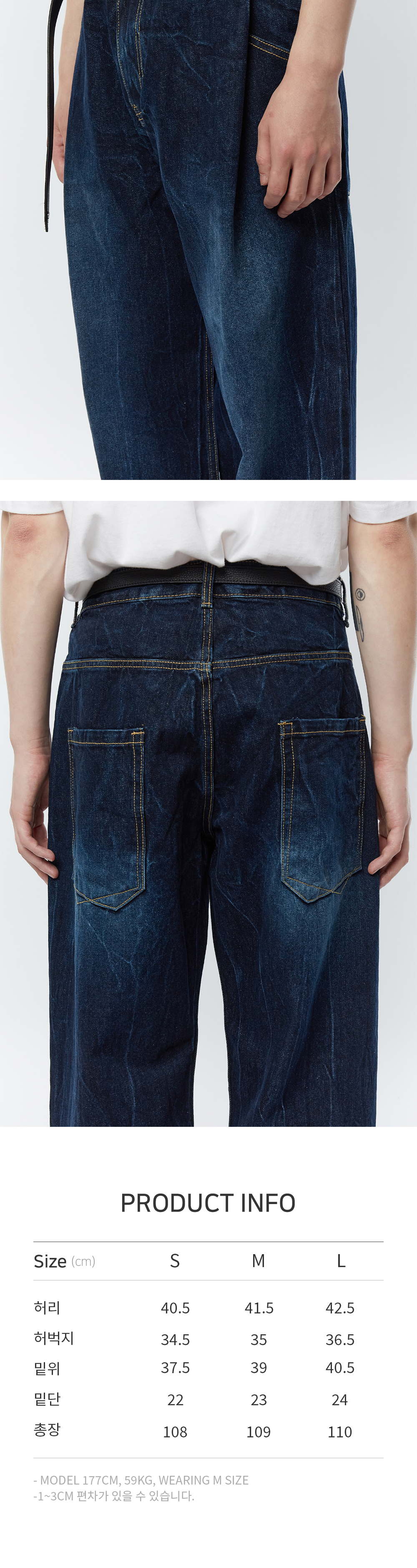 22FW 타이핑 미스테이크에서 새롭게 선보이는 턱 와이드 데님 팬츠입니다. 13oz 고밀도 데님 원단을 사용하여 제품을 만들었으며 이후 크랙 워싱 가공을 통해 이염 및 수축을 보완하였습니다. 앞부분에 적용된 턱 디테일이 포켓 입구를 살짝 가리는 쉐입과 뒷부분 의도적으로 어긋나게 전개한 아웃포켓 스티치로 타이핑 미스테이크 특유의 위트 있는 디자인을 표현하였습니다. 착용자의 습관이나 생활 환경에 따라서 자연스러운 갱년 변화가 진행되는 것이 특징입니다. 해상도에 따라서 색상 차이가 있을 수 있습니다.