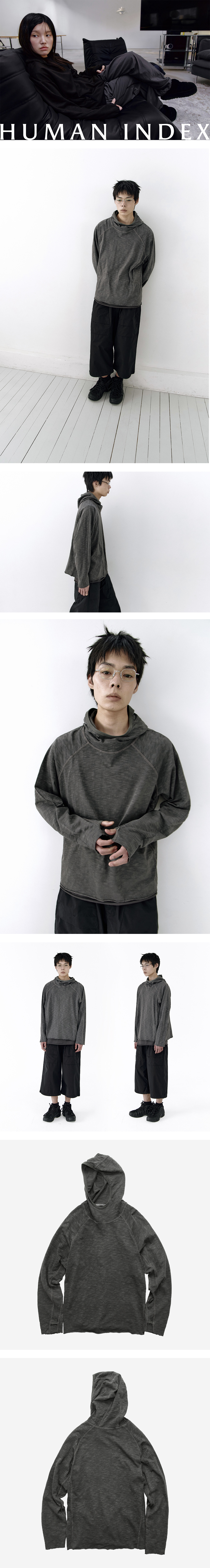 human turtle neck hoodie - 하이넥 타입의 후드 - 핑거홀 디테일 - 요철감이 느껴지는 슬럽 원단 - 러프한 밑단 & 소매 마감 - 사이드 패널로 입체적인 디자인 *남성 모델 : 180cm / 마른 체형, 4사이즈 착용 * 레이어링에 용이하도록 전반적으로 여유 있게 조정된 실루엣으로 완성