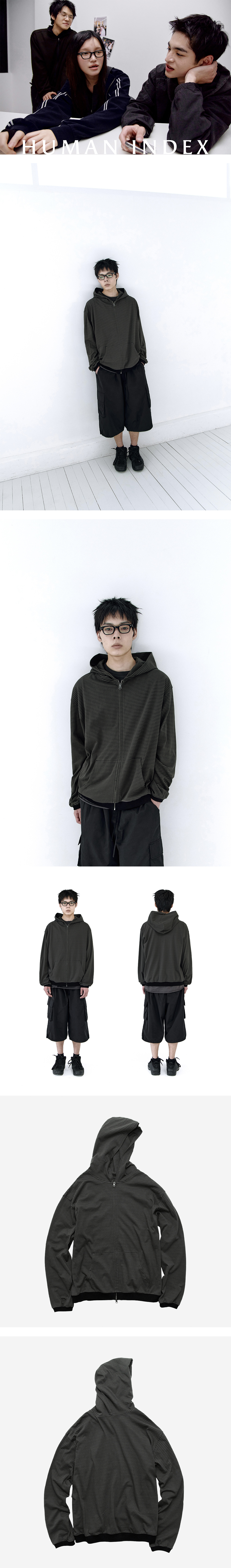 human striped zip hoodie - 얇고 부드러운 스트라이프 원단 - 넉넉한 깊이감의 후드 - 밀리터리 타입 투웨이 지퍼 - 적당한 텐션의 짧은 소매 & 밑단 립 *남성 모델 : 180cm / 마른 체형, 4사이즈 착용