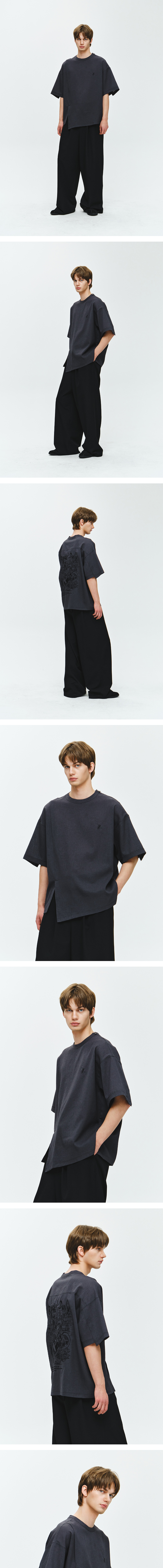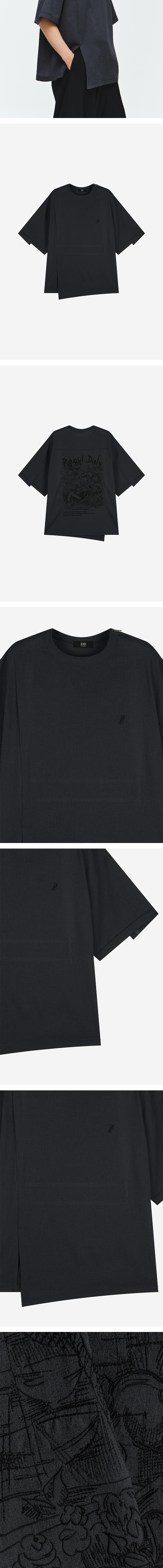 - 마드리갈 아트워크 티셔츠 - 시원한 여름용 린넨라이크 폴리 원단 - 앞판 어시메트릭 절개 디테일 및 로고 자수 - 뒷판 요크에 플리츠 디테일 및 라울 뒤피 아트워크 1도 자수 - 소매 단차 및 밑단 사선 컷팅으로 어시메트릭한 실루엣 연출