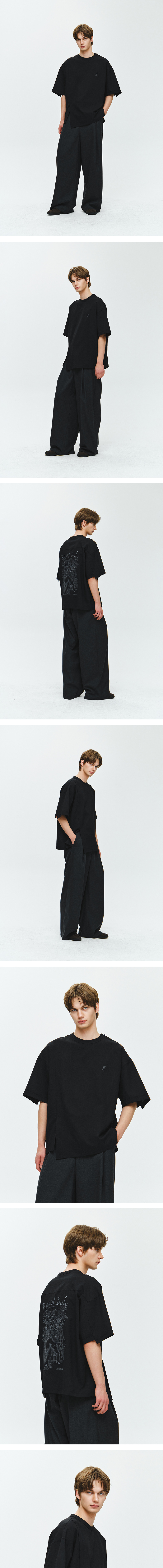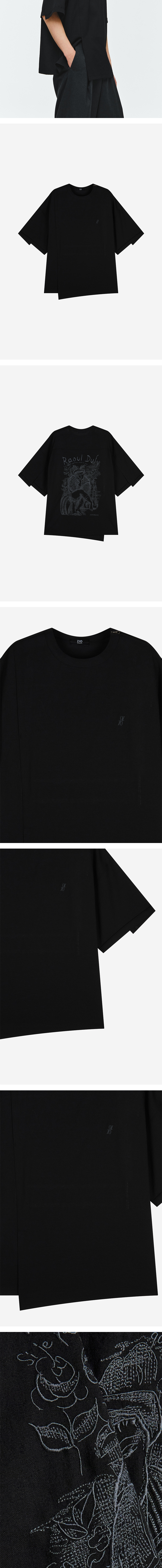 - 스플린 아트워크 티셔츠 - 시원한 여름용 린넨라이크 폴리 원단 - 앞판 어시메트릭 절개 디테일 및 로고 자수 - 뒷판 요크에 플리츠 디테일 및 라울 뒤피 아트워크 1도 자수 - 소매 단차 및 밑단 사선 컷팅으로 어시메트릭한 실루엣 연출