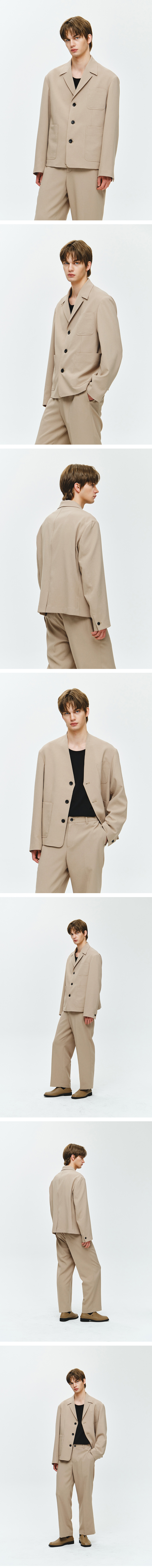 - 3 BUTTON OVER DROP FIT - 3버튼 라펠 디터쳐블 실루엣으로, 아방가르드한 룩 표현 - 자연스러운 크링클이 돋보이는 일본 수입 소재 사용 - 라펠 디테쳐블 디자인으로 다양한 연출 가능 - 노턱 세미와이드 실루엣의 팬츠로, 자켓과 함께 아방가르드한 실루엣 표현 - BI2PT264BE와 세트 구성