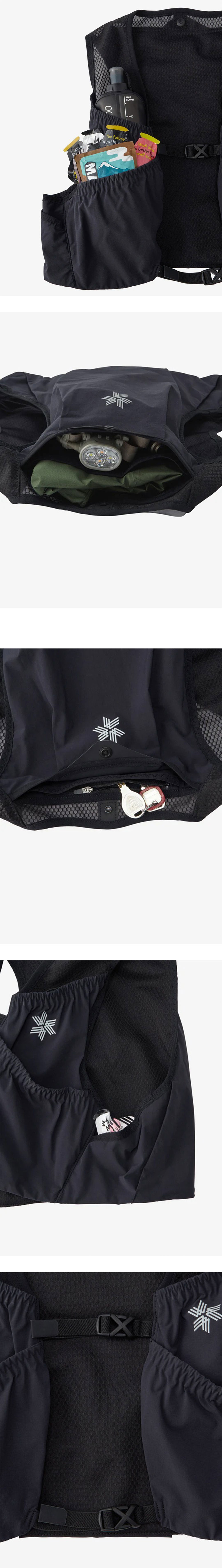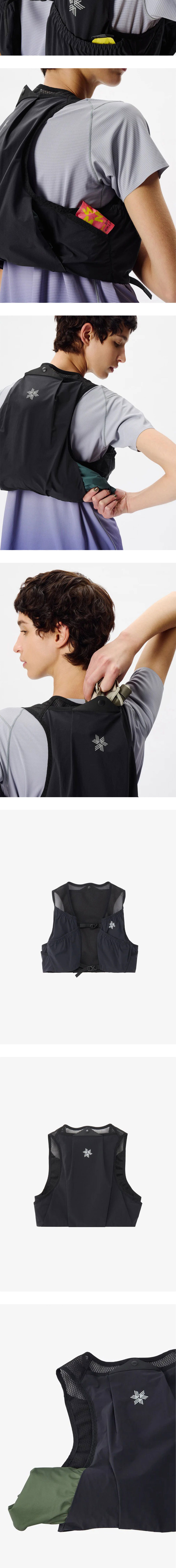 골드윈 스타 트레일 팩 블랙 입니다. - 세계적 트레일 러너와 협업한 초경량 고기능성 조끼 - 신축성 소재로 소지품 흔들림 없는 밀착감 제공 - 메쉬 등판과 높은 무게 중심 설계로 쾌적한 착용감 - 착용한 상태에서 소지품 접근이 용이한 수납 구조 *모델 스펙: 178cm 3 Size 착용