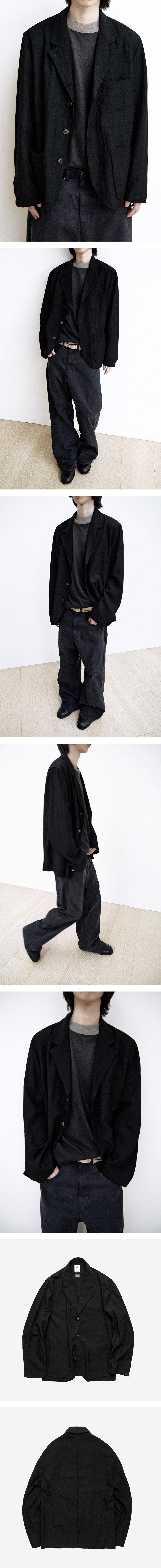 3 button blazer jacket - 유려한 실루엣으로 떨어지는 테일러드 자켓 - 가볍고 부드러운 소재감, 편안한 착용감. - 몸판과 은은하게 대비되는 다크 브라운 톤 버튼 사용 - 전면 3포켓 및 내부 1포켓 구성 - 부분 바택 디테일 및 안 시접 파이핑 마감 *모델: 178cm, 마른 체형 / 3사이즈 착용