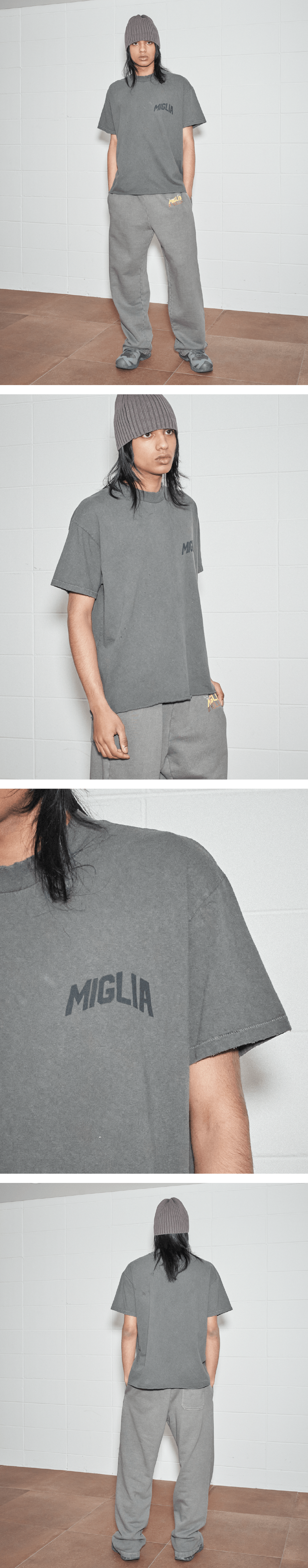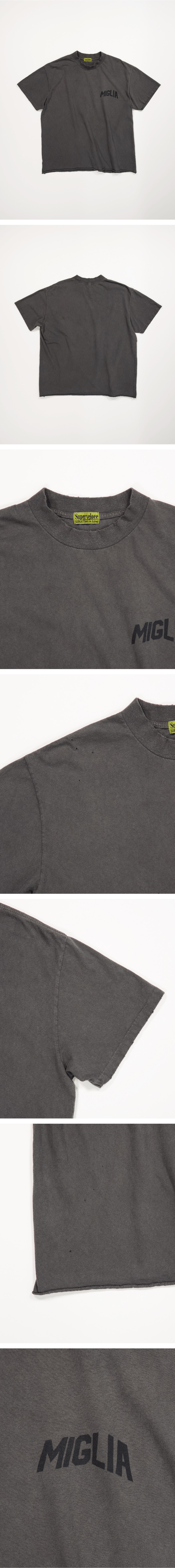 Phase 3 : Miglia di Follia 세상에서 가장 아름다운 광기 어린 레이스 오래된 티셔츠 특유의 건조하고 불규칙한 질감을 구현한 티셔츠입니다. 빈티지한 실루엣 위에 핸드 드로잉 Miglia 심볼이 특별한 포인트를 주는 제품입니다. + 리사이클 원사를 사용한 20수 싱글 저지 + 핸드 드로잉 Miglia 심볼 프린트 + 루즈하게 재해석한 모크넥 디자인 + 크롭 기장의 롤링 컷 밑단 디테일 + 디스트레스, 핀홀 등 에이징 디테일 + 싱글 스티치(수소봉제) 마감 + 워싱감이 풍부한 가먼트 다잉 + Cotton 100% + Made in Korea + 모델(178cm) 착용 사이즈 L