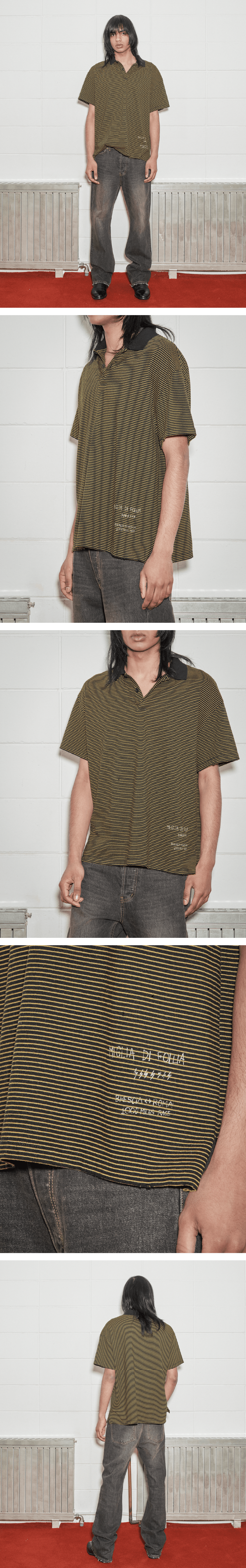 Phase 3 : Miglia di Follia 세상에서 가장 아름다운 광기 어린 레이스 이미 오랜 시간을 지나온 듯한 부드러운 터치와 디테일로 내추럴함을 강조한 클래식 폴로셔츠입니다. + 클래식 미니 스트라이프 싱글 저지 + 워싱 공정을 거친 나른한 핏과 텍스처 + 와이드한 품과 크롭 기장 실루엣 + 디스트레스, 핀홀 등 에이징 디테일 + 핸드 드로잉 프린트 디테일 + Cotton 100% + Made in Korea + 모델(178cm) 착용 사이즈 L