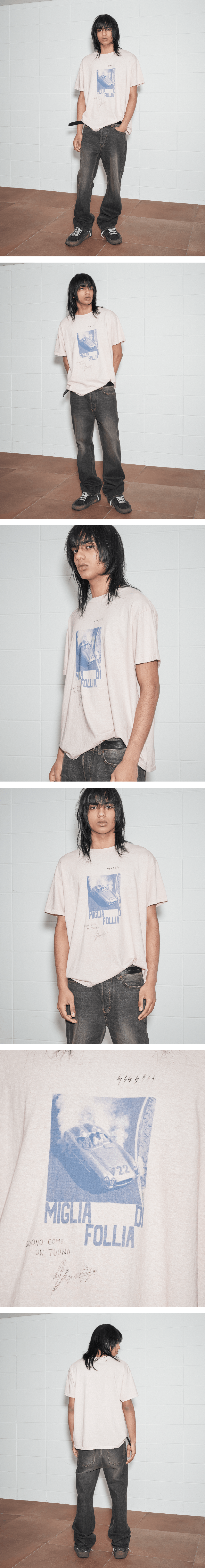Phase 3 : Miglia di Follia 세상에서 가장 아름다운 광기 어린 레이스 오래된 티셔츠 특유의 건조하고 불규칙한 질감을 구현한 티셔츠입니다. 로드 레이스 'Mille Miglia' 속 레전드들을 표현한 시리즈 그래픽이 더해졌습니다. + 리사이클 원사를 사용한 20수 싱글 저지 + 핸드 드로잉과 함께 표현된 빈티지 그래픽 프린트 + 릴렉스드 핏과 크롭 기장 실루엣 + 디스트레스 에이징 디테일 + 싱글 스티치(수소봉제) 마감 + 워싱감이 풍부한 가먼트 다잉 + Cotton 100% + Made in Korea + 모델(178cm) 착용 사이즈 L
