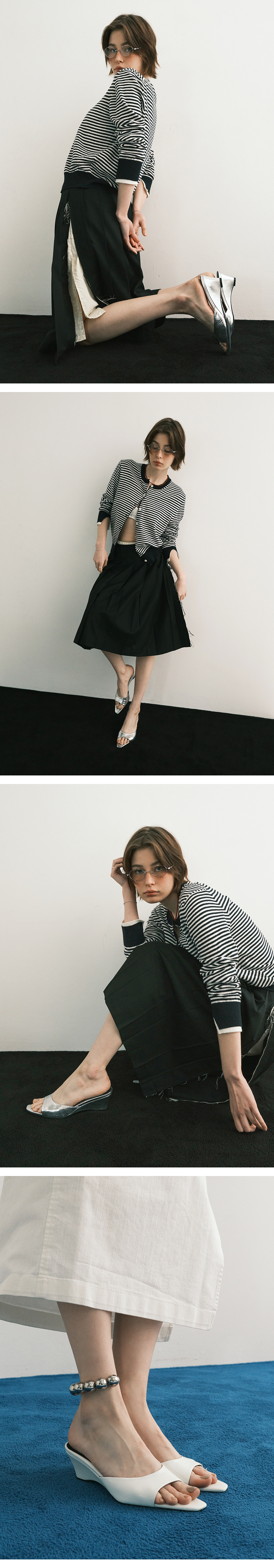 클린한 실루엣의 곡선 웨지힐이 매력적인 뮬 샌들.