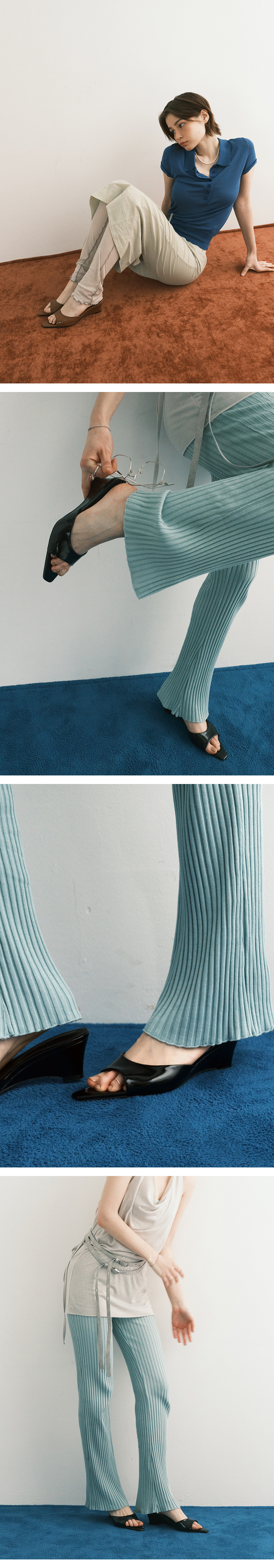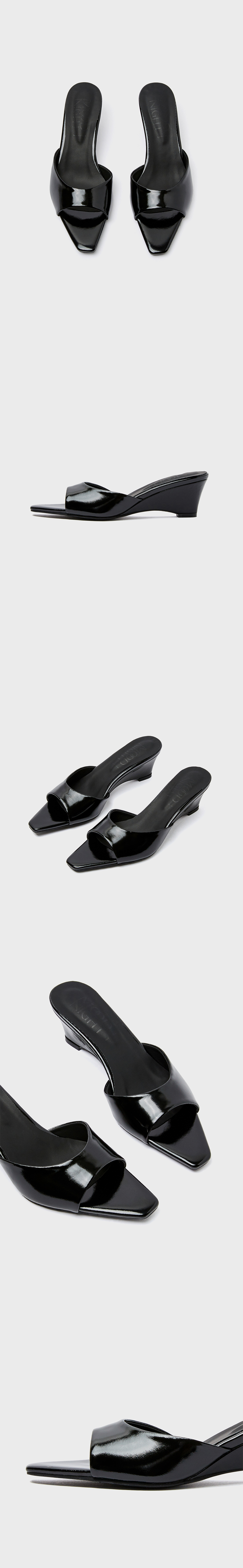 클린한 실루엣의 곡선 웨지힐이 매력적인 뮬 샌들.