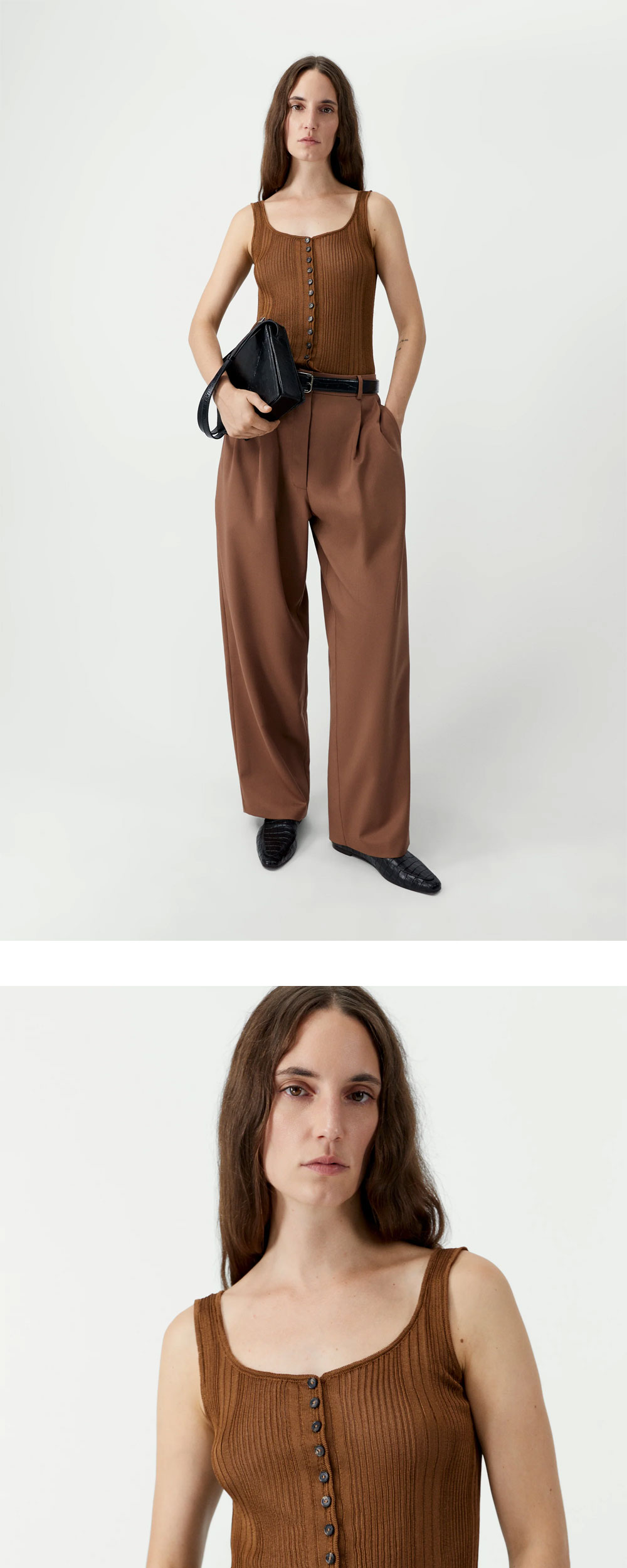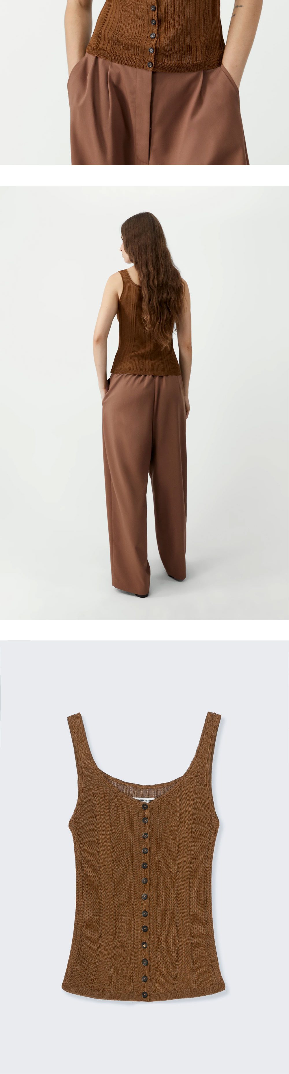 코데라 우먼 리브드 탱크 탑 타바코입니다. - 섬세한 리브 조직으로 편안한 신축성과 가벼운 통기성을 구현한 니트 탑 - 전면 중앙의 촘촘한 버튼 디테일로 미니멀한 실루엣에 감각적인 포인트 - 라 코루냐에서 일본식 편직기를 사용해 수작업으로 완성한 높은 퀄리티 - 재활용 원사로 제작되어 환경에 미치는 영향을 최소화한 친환경 아이템 *모델 스펙: 177 cm, One Size 착용