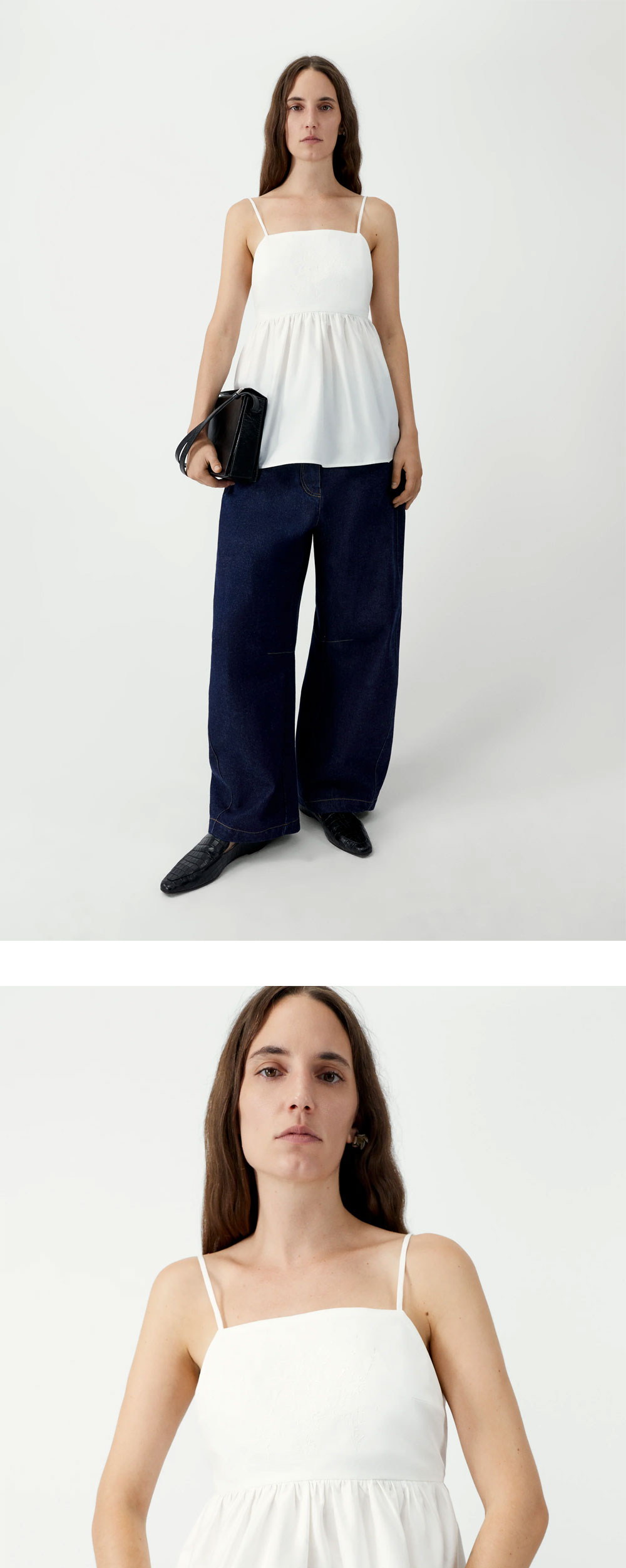 코데라 우먼 코튼 엠브로이더드 탑 화이트입니다. - 가벼운 코튼 소재 위에 톤온톤으로 새겨진 섬세한 플로럴 자수 디테일 - 조절 가능한 드로우스트링 스모킹과 로우 백 디자인으로 제안하는 자유로운 핏 - 가느다란 스파게티 스트랩과 스퀘어 넥라인이 선사하는 페미닌한 무드 - 갈리시아에서 지속 가능한 공정으로 제작된 친환경 하이 퀄리티 피스 *모델 스펙: 177cm, One Size 착용