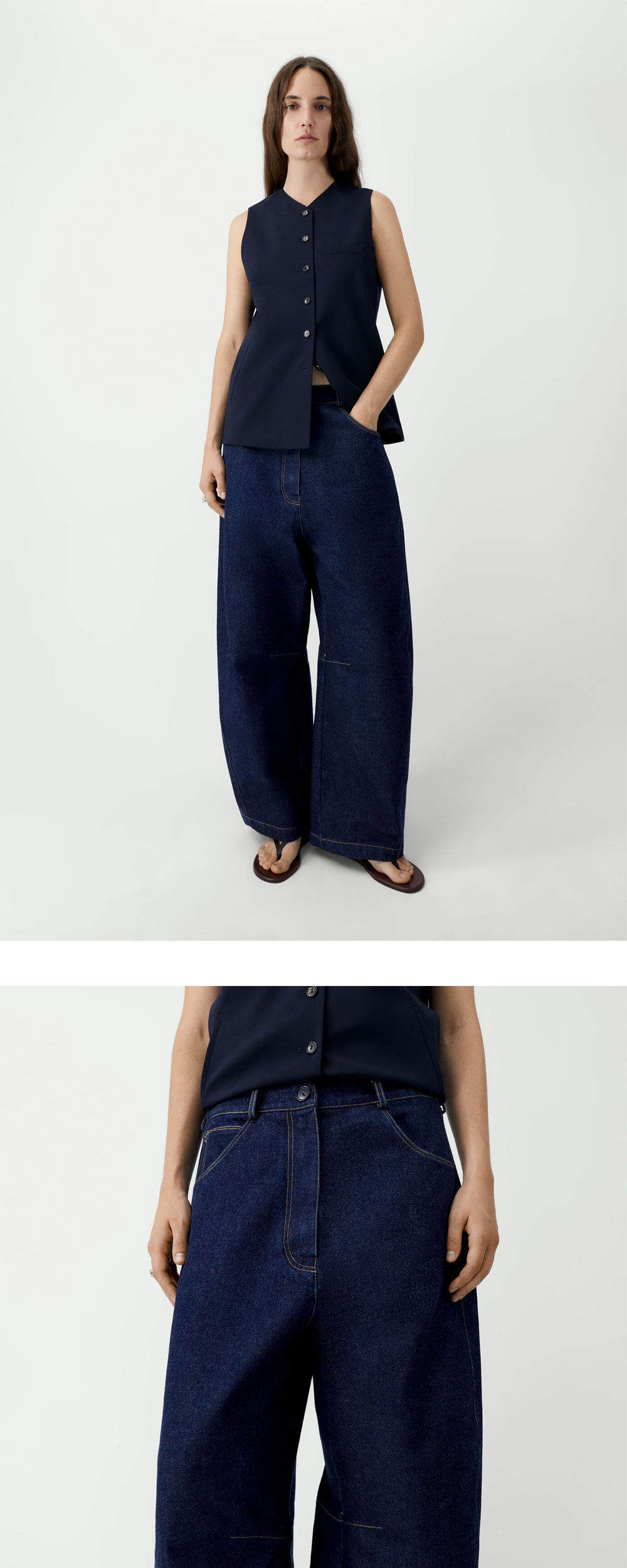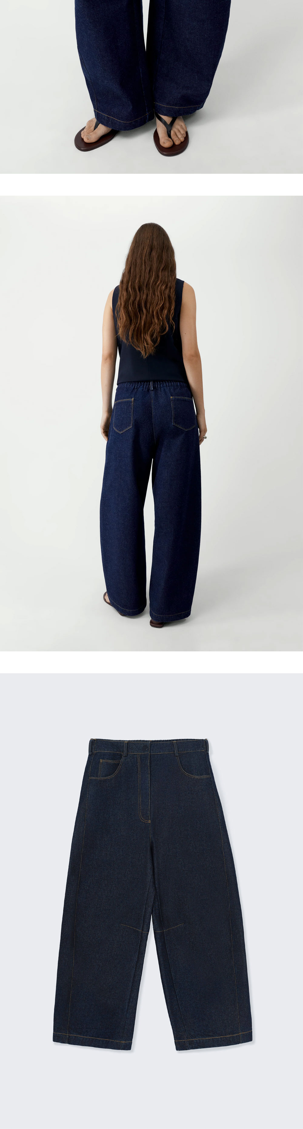 코데라 우먼 커브드 배기 진스 데님입니다. - 깊이 있는 다크 데님 워싱에 톤온톤 스티치를 더한 배기 진 - 여유로운 오버사이즈 핏과 로우 라이즈 디자인 - 전면 3개, 후면 2개의 전통적인 5포켓 구성과 벨트 루프 - 무릎 안쪽의 유니크한 심 라인 디테일 *모델 스펙: 177cm, 1 Size 착용