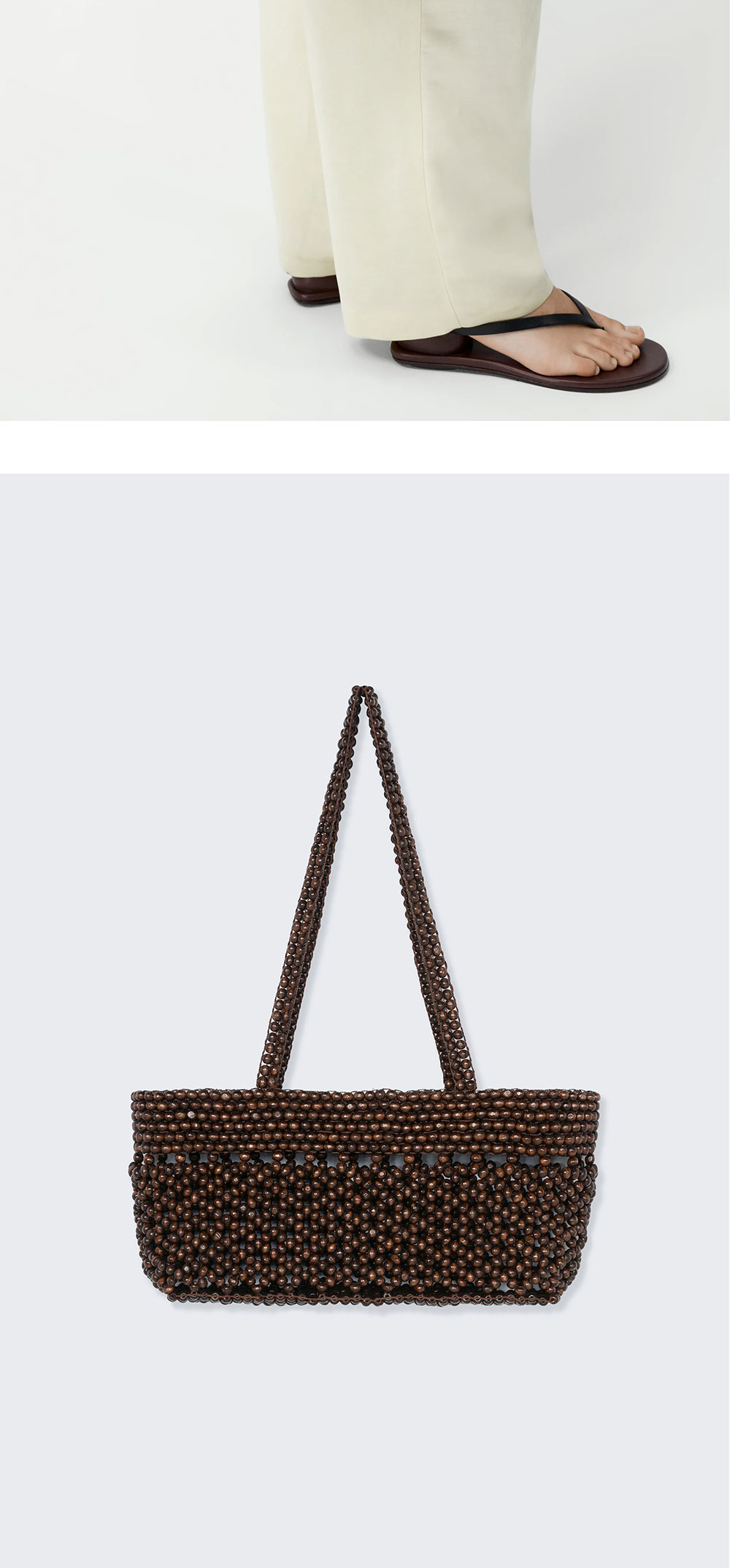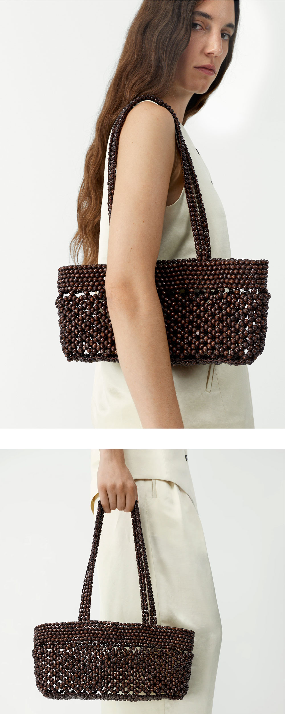 코데라 우먼 우든 비즈 미니 백 브라운 입니다. - 브라운 톤의 우드 비즈로 제작된 핸드메이드 디자인 - 입체적인 질감이 돋보이는 비즈 직조 디테일 - 일체형 구조의 긴 숄더 스트랩 - 미니멀한 직사각형 실루엣 - 오픈형 상단 수납 구조