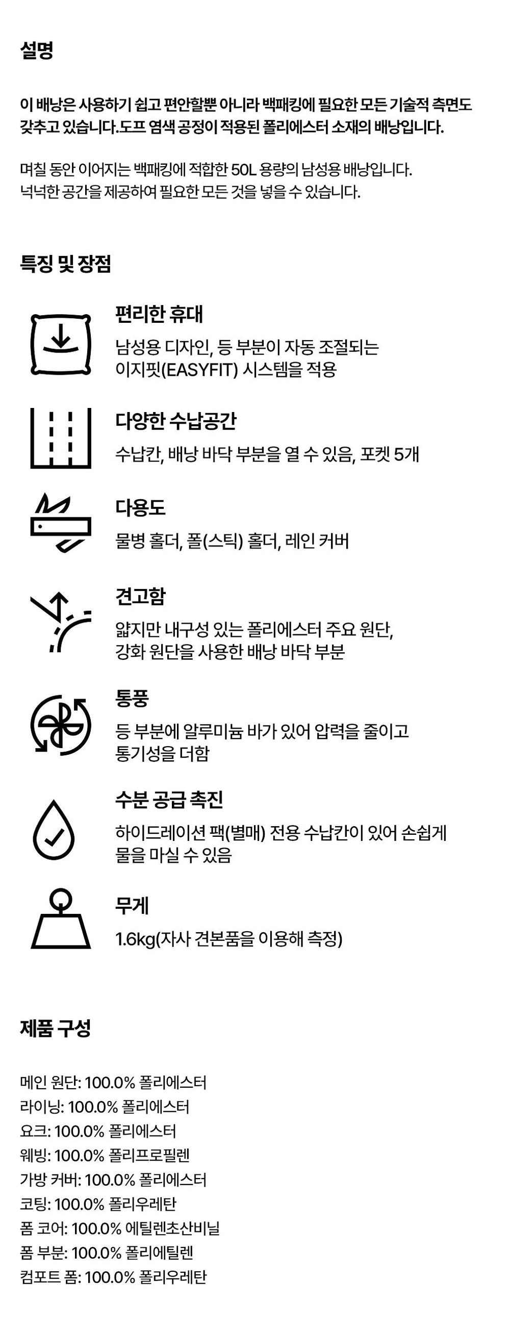 데카트론 남성 백패킹 백팩 50L 이지핏 MT100 카본 그레이