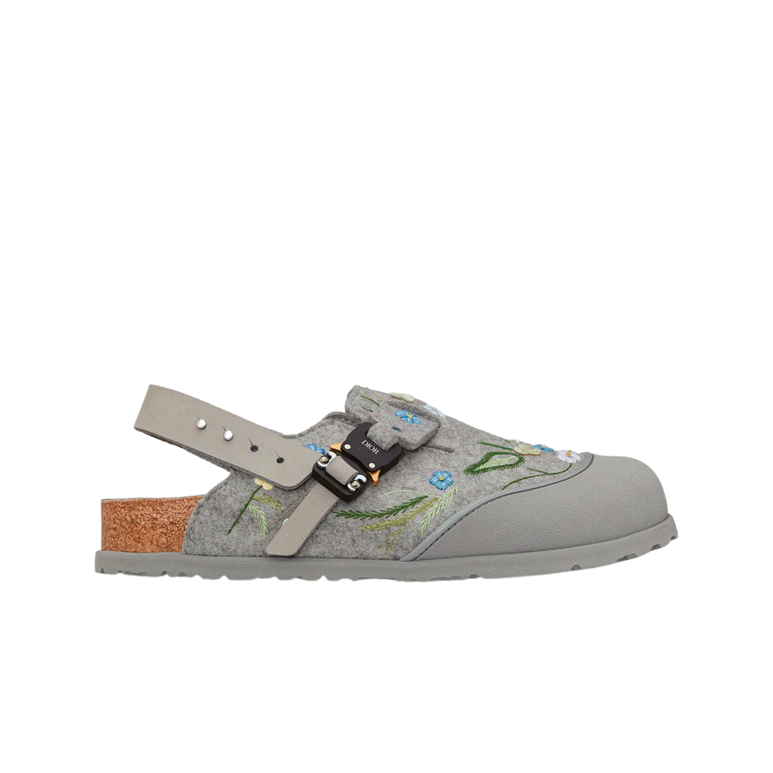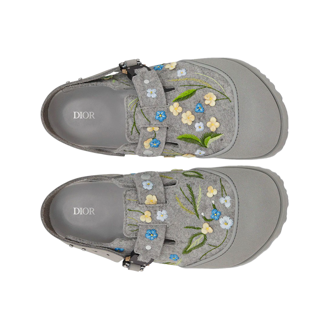 Dior x Birkenstock Tokio Mule Felted Wool Embroidered with Flowers and Nubuck Calfskin Grey